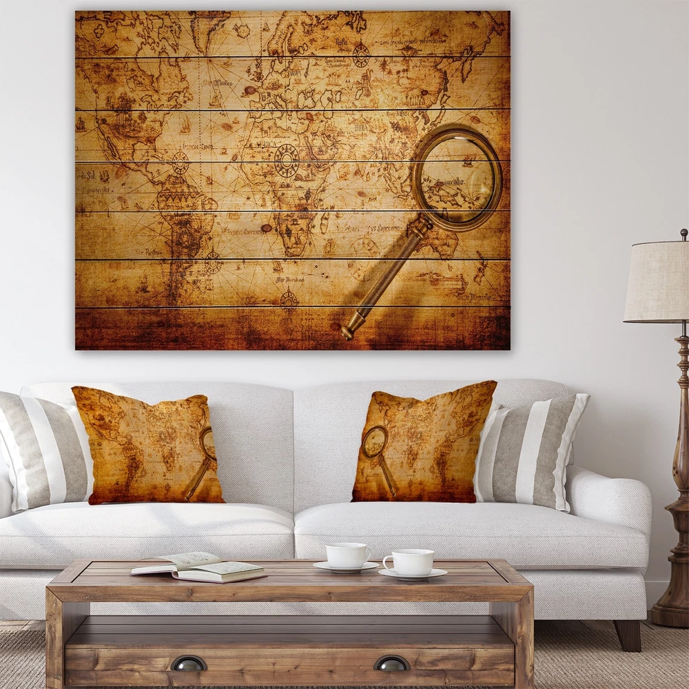 Alas, a modern take on wood wall art. Once typically a wall art piece found only in rustic or farmhouse style decor settings, this Map wood wall art will easily fit into even the most contemporary of designs.Using the highest quality 6 Color Canon UV Ink, this Global wood wall art incorporates several aspects of fine design into one stunning piece. With its slightly visible wood grain appearing through the colors and sleekly finished edges, it is a wonderful choice for any room in your home or office, being it a traditional or modern space. As each piece of wood has natural grain differences from the next, each of these wood wall arts is a truly unique addition to your space.Each Wood wall art is 100% handmade in Canada on Natural pine wood, using the highest quality ink which will not Free Shipping Over $49.99* Details Designart 'Vintage World Map' Vintage Print on Natural Pine Wood - Gold Product Description: Alas, a modern take on wood wall art. Once typically a wall art piece found only in rustic or farmhouse style decor settings, this Map wood wall art will easily fit into even the most contemporary of designs. Using the highest quality 6 Color Canon UV Ink, this Global wood wall art incorporates several aspects of fine design into one stunning piece. With its slightly visible wood grain appearing through the colors and sleekly finished edges, it is a wonderful choice for any room in your home or office, being it a traditional or modern space. As each piece of wood has natural grain differences from the next, each of these wood wall arts is a truly unique addition to your space. Each Wood wall art is 100% handmade in Canada on Natural pine wood, using the highest quality ink which will not fade over time. Available in 3 Differents sizes 20x15, 40x30, 46x36 - OrientationHorizontal - SubjectMap TypeWood Wall Art, Fine Art, Wood Fine Art, Print on Plaque - Arrives ready to hang on the wall with hanging kit included - MaterialMade with 100% natural pine wood - StyleGlobal- Number of Pieces1 - SizeMedium, Large, Small - ColorGold