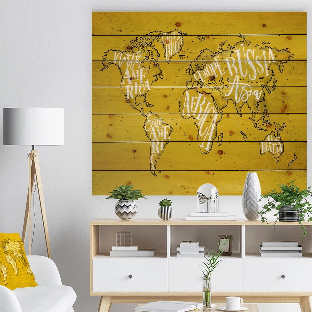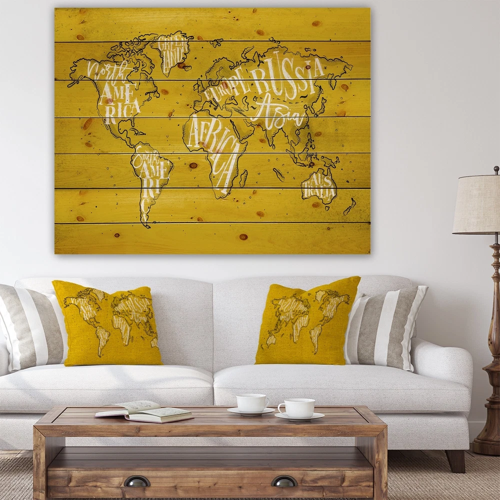 Alas, a modern take on wood wall art. Once typically a wall art piece found only in rustic or farmhouse style decor settings, this Map wood wall art will easily fit into even the most contemporary of designs.Using the highest quality 6 Color Canon UV Ink, this Global wood wall art incorporates several aspects of fine design into one stunning piece. With its slightly visible wood grain appearing through the colors and sleekly finished edges, it is a wonderful choice for any room in your home or office, being it a traditional or modern space. As each piece of wood has natural grain differences from the next, each of these wood wall arts is a truly unique addition to your space.Each Wood wall art is 100% handmade in Canada on Natural pine wood, using the highest quality ink which will not Free Shipping Over $49.99* Details Designart 'Vintage Yellow Worldmap' Maps Print on Natural Pine Wood - Product Description: Alas, a modern take on wood wall art. Once typically a wall art piece found only in rustic or farmhouse style decor settings, this Map wood wall art will easily fit into even the most contemporary of designs. Using the highest quality 6 Color Canon UV Ink, this Global wood wall art incorporates several aspects of fine design into one stunning piece. With its slightly visible wood grain appearing through the colors and sleekly finished edges, it is a wonderful choice for any room in your home or office, being it a traditional or modern space. As each piece of wood has natural grain differences from the next, each of these wood wall arts is a truly unique addition to your space. Each Wood wall art is 100% handmade in Canada on Natural pine wood, using the highest quality ink which will not fade over time. Available in 3 Differents sizes 20x15, 40x30, 46x36 - OrientationHorizontal - SubjectMap TypeWood Wall Art, Fine Art, Wood Fine Art, Print on Plaque - Arrives ready to hang on the wall with hanging kit included - MaterialMade with 100% natural pine wood - StyleGlobal- Number of Pieces1 - SizeMedium, Large, Small - ColorYellow