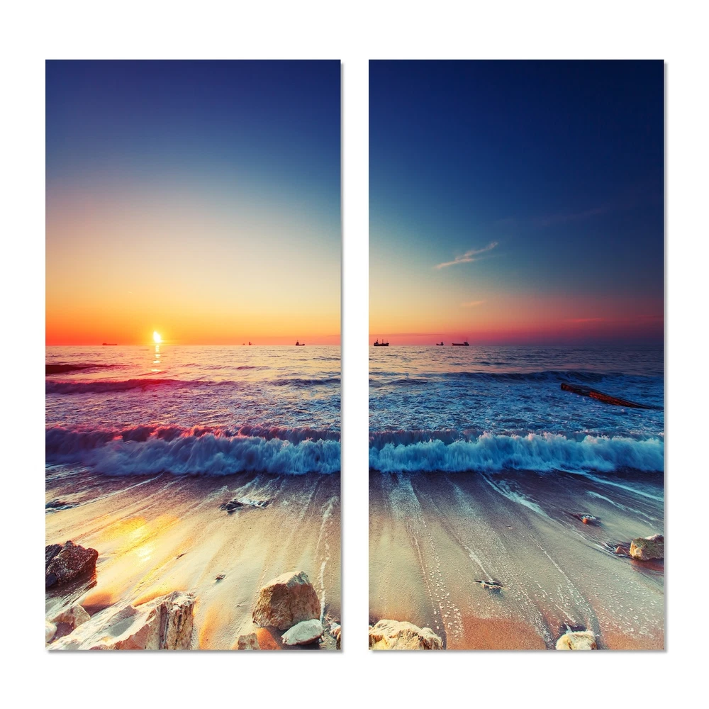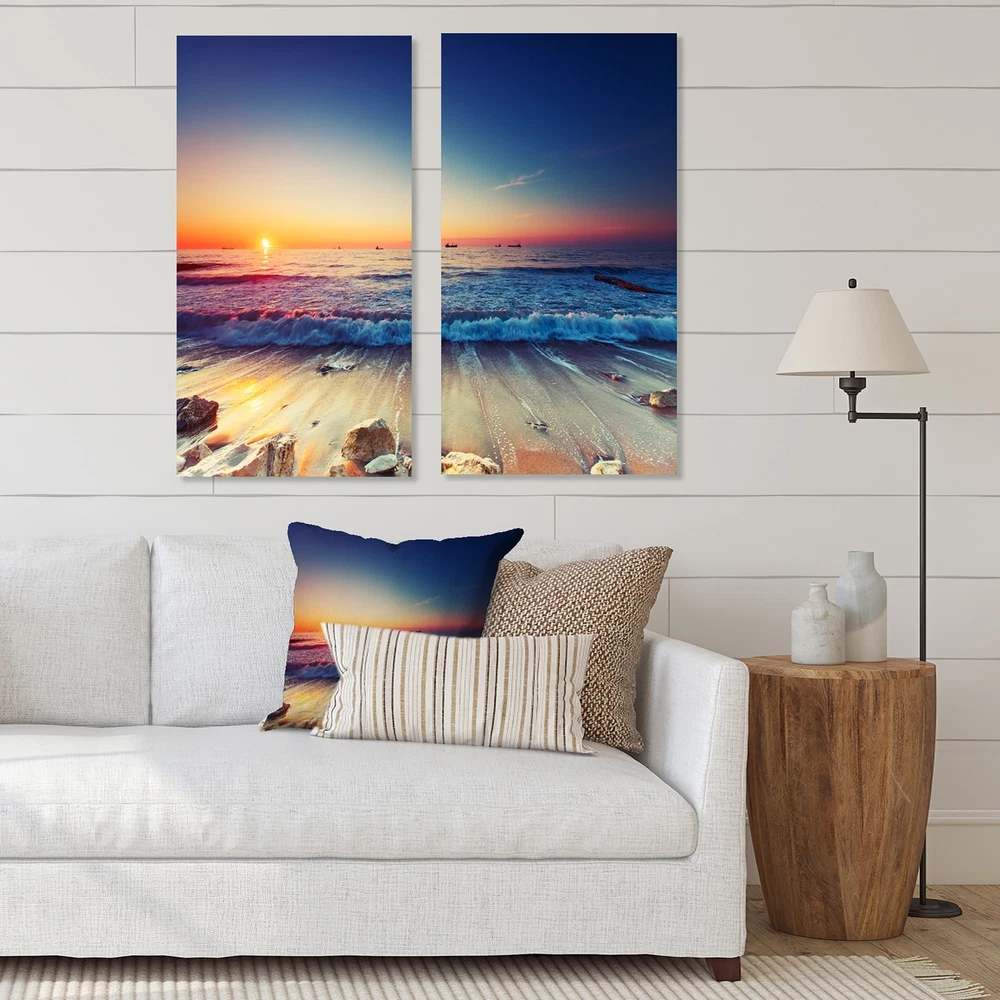 This beautiful Nautical & Coastal 2 piece set of Canvas Art is printed using the highest quality fade-resistant ink on canvas. Every one of our fine art giclee canvas prints is printed on premium quality cotton canvas, using the finest quality inks which will not fade over time. Each giclee print is stretched tightly over a 1-inch wood sub frame ensuring the canvas is taught and does not buckle. This canvas art print is gallery-wrapped (the design continues on the sides), giving it a real art gallery feel. All of our canvas prints are carefully packaged with plastic protection, fragile labeling, and sturdy boxes to ensure safe delivery. Every canvas print arrives ready to hang on the wall, with the hanging kits included.- Style : Nautical & Coastal- Subject : Beach, Landscapes- Color : Free Shipping Over $49.99* Details Designart "Beautiful Sunrise over Blue Sea" Seashore Canvas Wall Art Print 2 Product Description: This beautiful Nautical & Coastal 2 piece set of Canvas Art is printed using the highest quality fade-resistant ink on canvas. Every one of our fine art giclee canvas prints is printed on premium quality cotton canvas, using the finest quality inks which will not fade over time. Each giclee print is stretched tightly over a 1-inch wood sub frame ensuring the canvas is taught and does not buckle. This canvas art print is gallery-wrapped (the design continues on the sides), giving it a real art gallery feel. All of our canvas prints are carefully packaged with plastic protection, fragile labeling, and sturdy boxes to ensure safe delivery. Every canvas print arrives ready to hang on the wall, with the hanging kits included. - Style Nautical & Coastal - Subject Beach, Landscapes - Color Blue - This canvas giclee print is gallery-wrapped (the design continues on the sides), giving it a real art gallery feel. - Premium quality cotton canvas. - Arrives ready to hang on the wall - Easy to Hang