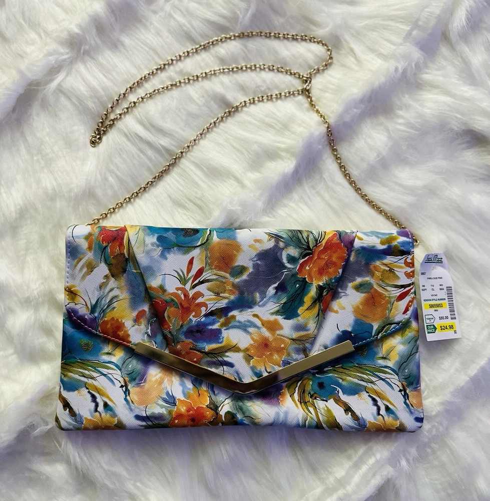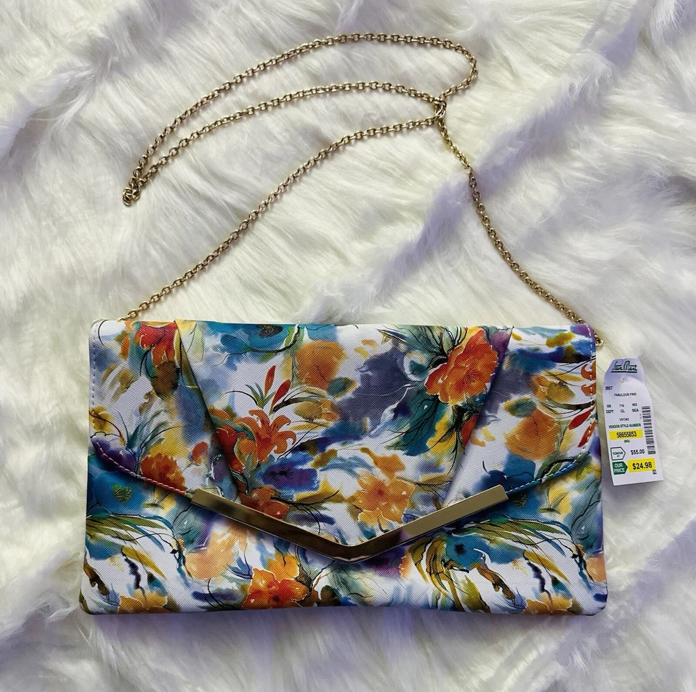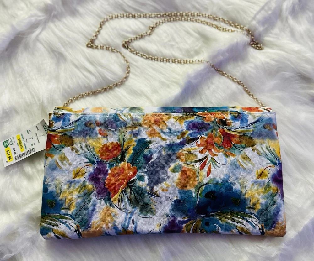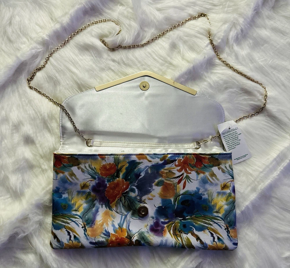New with Tags Add some vibrant color to your outfit with this stunning designer handbag. The multi-color floral pattern is eye-catching and perfect for any occasion. The gold chain adds a touch of elegance and the snap closure keeps your belongings secure. This crossbody clutch purse is perfect for women who want to stay stylish and organized. The Madden brand is known for quality and this bag is no exception. The lining and hardware are also gold, adding to the overall luxury of the bag. Embrace the colorful theme with this beautiful handbag.