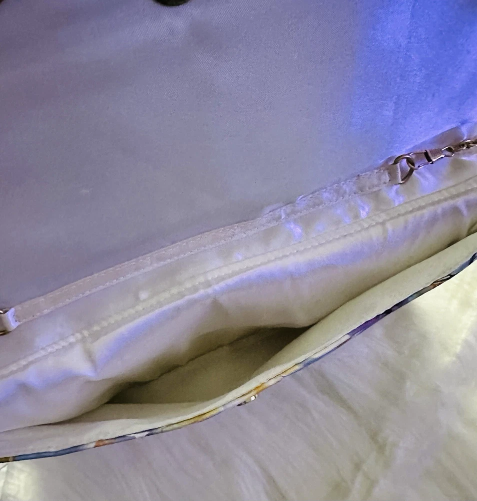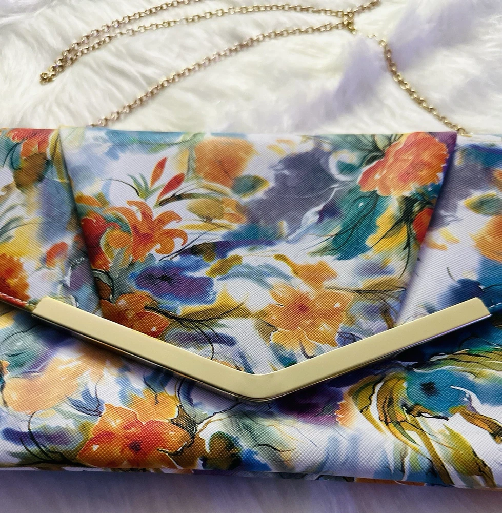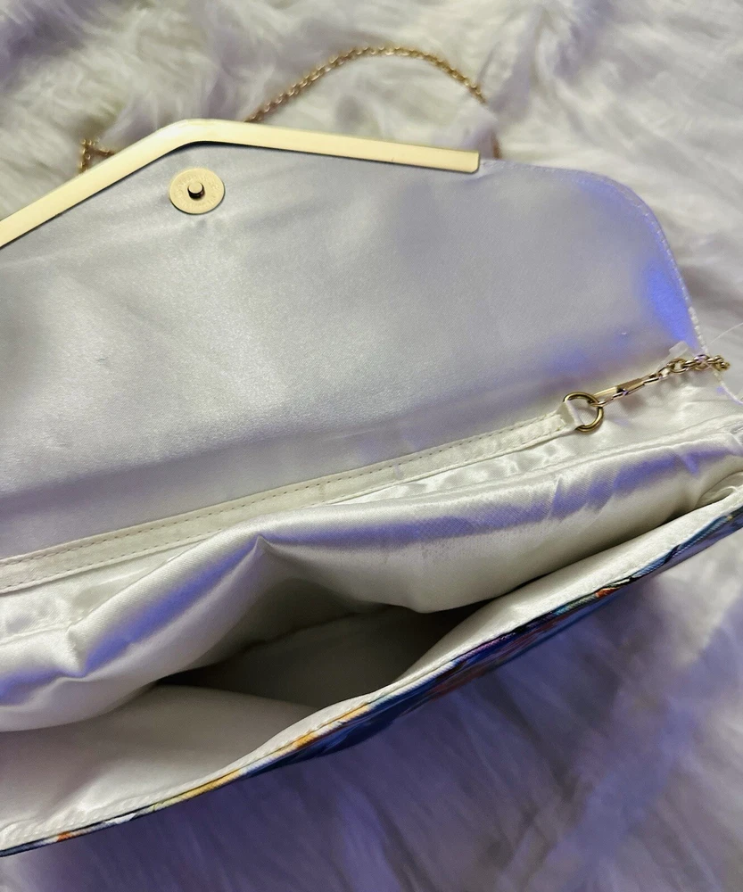 New with Tags Add some vibrant color to your outfit with this stunning designer handbag. The multi-color floral pattern is eye-catching and perfect for any occasion. The gold chain adds a touch of elegance and the snap closure keeps your belongings secure. This crossbody clutch purse is perfect for women who want to stay stylish and organized. The Madden brand is known for quality and this bag is no exception. The lining and hardware are also gold, adding to the overall luxury of the bag. Embrace the colorful theme with this beautiful handbag.