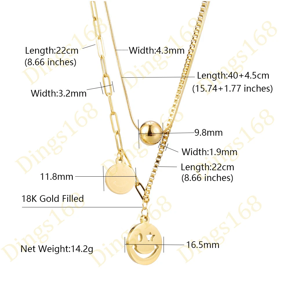 This listing is for one piece of designer inspired 18k gold filled snake/box/paper clip chain 3 layered necklace. It is hypoallergenic and waterproof, so you can do your daily routine without having to take it off. This timeless essential is the perfect gift idea for anyone - your significant other, family, friends, or for yourself. Give someone special luxurious fine jewelry to rock from day to night with style. It is covered under our 60-day 100% money-back guarantee. *** Free gift packaging included. Product ID: C1320 Metal: 18K Yellow Gold Filled Color: Gold Product Dimension: Lower Chain- Strand 1: Paper Clip Chain: 3.2mm wide, Length: 8.66 inch/ 22 cm Lower Chain- Strand 2: Box Chain: 4.3mm wide, Length: 8.66 inch/ 22 cm Lower Chain (Total) : 17.32 inch /44cm + 4.5mm extender (19.09 inch in total) Upper Chain: Snake Chain: 1.9mm wide, Length: 15.74 inch/ 40 cm + 4.5mm extender (17.5 inch in total) Pendant 1: 0.65 x 0.65 inch / 16.5 x 16.5 mm (excluding bail) Pendant 2: 0.46 x 0.46 inch / 11.8 x 11.8 mm (excluding bail) Pendant 3: 0.38 x 0.38 inch / 9.8 x 9.8 mm Weight: 14.2 gram Quantity: One 2-layered necklace with 3 pendants Gold filled jewelry is different from gold plated jewelry. Gold filled jewelry is made by heat and pressure bonding a layer (at least 25 micron thickness) of gold to some base metal core. It has all the great characteristics of solid gold jewelry. It does not flake off, tarnish or discolor. Gold filled jewelry is an economical alternative to solid gold. Gold plated is a method of covering another type of metal with a very thin, almost microscopic (usually 0.5-micron thick), film of pure gold by electroplating it. Gold-filled jewelry is much more valuable than gold-plated. As an additional note, 18K yellow/rose is more yellow than 14K (or 10K) yellow/rose gold, as 18K contains 75% pure gold, while 14K contains 58.5% gold and 10K contains 41.7% gold. 18K white gold appears similar to 14K/10K white gold. Note: *** This multiple-layered necklace comes with a 1.77-inch/4.5cm long extender. So it fits 17.32 - 19.09 inch *** Please always refer to the description for the measurement of the product. Please do not judge the size based on the picture on your screen. The product may look larger or smaller based on your screen size. 100% Satisfaction Guarantee We offer 100% satisfaction guarantee for all products we sell. If you are not 100% satisfied, you may always return the product for full refund or exchange within 60 days of purchase. Shipping & Payment All orders are shipped through USPS(Postal Office) from our warehouse in California, USA within 24 hours after your payment reaches us. For International buyers: We ship to all countries. We pay all shipping charge in full before your package is shipped. For international buyers, you may be collected an fee when the package is delivered. It's an importing tax that your government charges to protect your domestic business and job opportunities. It's the buyer's responsibility to pay the tax. Contact us The best way to contact us is through eBay message by using eBay's "ask a question" link.