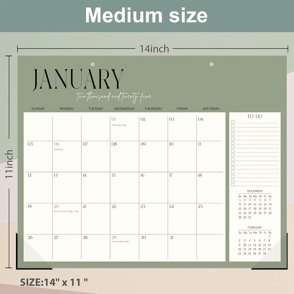 Menu Other Items Feedbacks About Us Contact Us Add To Favorites Desk Calendar 2025, Desk Top Calendar 2025, 18-Month School Year Desk/Wall Calendar, 2025 Jan-2026 June, 14" X 11" Monthly Planner with Thick Paper for Office Home School Organizing Blooming Inspiration: Get ready to inject modern glamor into your home or office space with our 2025-2026 desk calendar! Each month showcases unique designs, elegant fonts, and desaturated, trendy colors. It's like bringing a burst of fashion indoors, keeping your study or office environment fresh and vibrant all year round Academic Mastery: Elevate your planning game with our 18-month paper desk calendar crafted to help you conquer your school year. Whether you're balancing coursework, managing extracurriculars, social commitments, the spacious layout provides ample room for jotting down important notes and tasks. All 18 months at a glance, major holidays, and easy-to-reference months, staying on top of your assignments and events has never been easier Goodbye to Low Quality Calendars: Say farewell to flimsy calendars that can't keep up with your busy schedule! Our 2025 monthly desk calendar features 120 GSM paper, providing a premium writing experience with no ink feathering or seepage Welcome Your New Wall Decor: Say hello to your new go-to desk accessory! Our 18-month school year calendar 2025-2026 is perfectly sized at 14*11 inches, striking the ideal balance between functionality and convenience. Hang it on your wall or place it on your desk—either way, its vibrant colors and sturdy corner guards will keep your school life organized and stylish Shop with Confidence: We strive to offer top-notch products and unparalleled service. Should you have any issues or questions with our academic calendars, planners & organizers, please reach out to us Product Description 19 Monthly Desk Wall Calendar 2025-2026 · Help you keep track of the highlighted holidays and special events. · This calendar planner helps to improve efficienty, saves time and reduces stress. · Maintain a balance between life and work to make you live better. CONVENIENT HANGING · Free up tons of space on your desktop EASY TO TRACK · This academic desk calendar runs from January 2025 through June 2026 -- Contain 19 months, more than 570 days. PROPER SIZE · DIMENSIONS: 14" X 11" Clear Corner Protectors Whether hanging on the wall or on the desktop, this corner protector will ensure that your calendar stays flat. Pre-punched Hanging Holes Allow you to hang it easily on your wall. Thick Paper Material Made of high-quality thick paper, without ink feathering, leakage, and shading issues, offering a smooth writing experience. Easy to hang and tear pages The GuassLee calendar is designed with convenient hanging holes and easy-to-tear page structure Easy to read Our team worked tirelessly to create a calendar that not only looks elegant and stylish but also provides ample space for you to write everything down. We understand how important it is to have a clear and concise view of your schedule, which is why we made sure that each page has plenty of room for appointments, reminders, and deadlines. Item Specification Item model number Calednar Color Green Material Paper Material Type Paper Manufacturer Part Number Calednar Item Weight 1.6 ounces Product Dimensions 14"W x 11"H Shipping FREE FREE SHIPPING We are always working hard to ensure your package arrives as soon as possible. Please understand that some factors like weather, high postal traffic, and the performance of shipping companies are outside of our control. We offer free shipping to the lower 48 states. We do not accept P.O. Boxes. Please provide a physical address. If you have a problem or question regarding your transaction please contact us immediately. We will work with you to resolve any problem you may have. Thank you