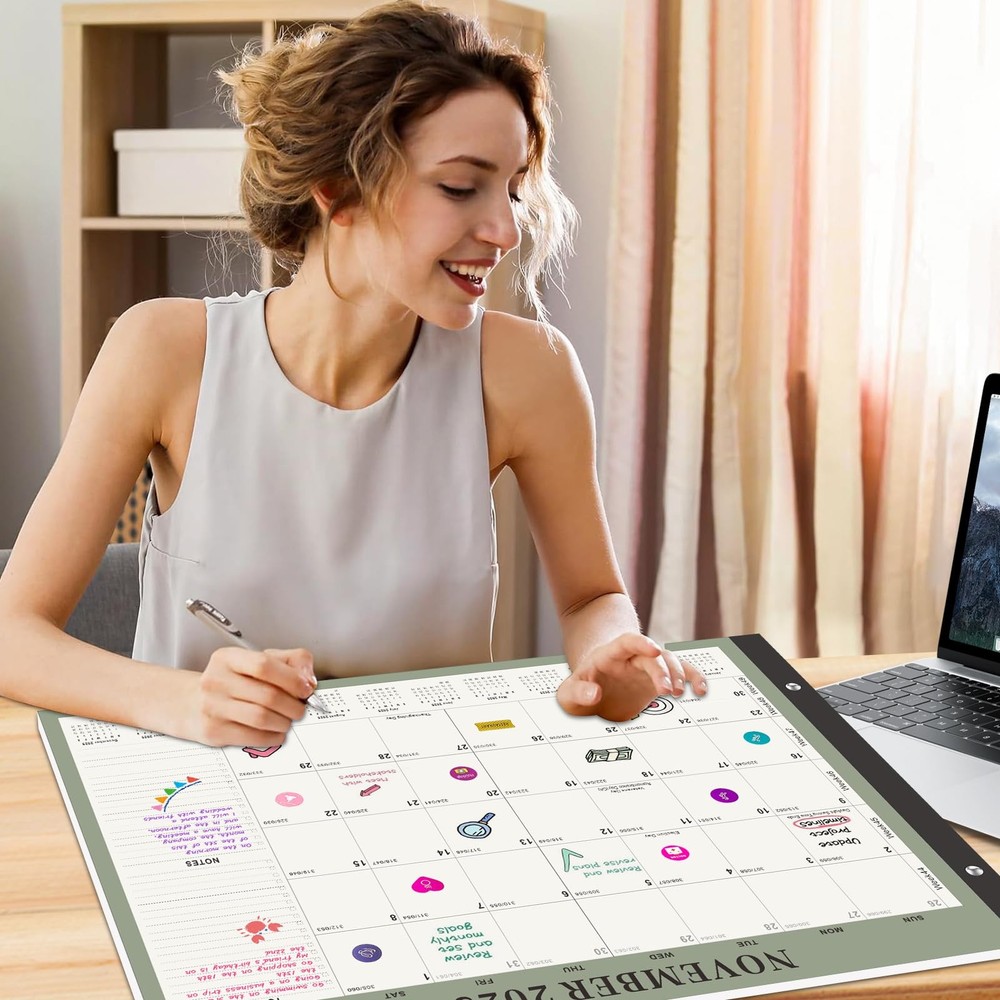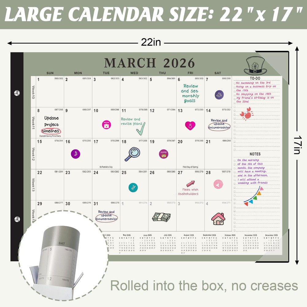 18 Monthly large 2026 desk calendar with 6 stickers, from now to Dec 2026. 22" x 17", Pages including daily blocks, notes, to do list, yearly mini monthly overview, US holiday reminders, to help you plan and organize office, school and family work efficiently. đăDesk Calendar 2026ă18 month large 2026 desk calendar with 6 stickers, from Now to Dec 2026. 22" x 17", Pages including daily blocks, notes, to do list, yearly mini monthly overview, US holiday reminders, to help you plan and organize office, school and family work efficiently. đăOrganization & PlanningăLarge monthly desk calendar 2026 adopts a daily block + notes + to do list area layout, providing more space for planning and organization. The daily block displays the progress of the whole year (past/remaining days) and holiday reminders, and comes with a full-year mini monthly calendar to help you organize your busy life and academic work, and easily track appointments and meeting activities đăPremium Thick Paperă- 2026 yearly academic desk calendar is made of high-quality thick paper, which can avoid ink penetration, providing you with a smooth writing experience and making your notes clear and easy to read. In addition, the cutting line allows you to easily tear off the pages of each month đăPlastic Cover & Two Corner ProtectorsăMonthly desk calendar with transparent plastic cover is waterproof and dustproof, and comes with two corner protectors to keep the page flat (Tip: You can write after opening the cover) đăUnique & Simple Designă2026 desk calendar combines schedule planning function with decorative aesthetics, selects 12 unique patterns, and uses low-saturation forest green to create a high-end texture. It is an excellent desktop decoration for teachers, students, academic organizers and office workers.