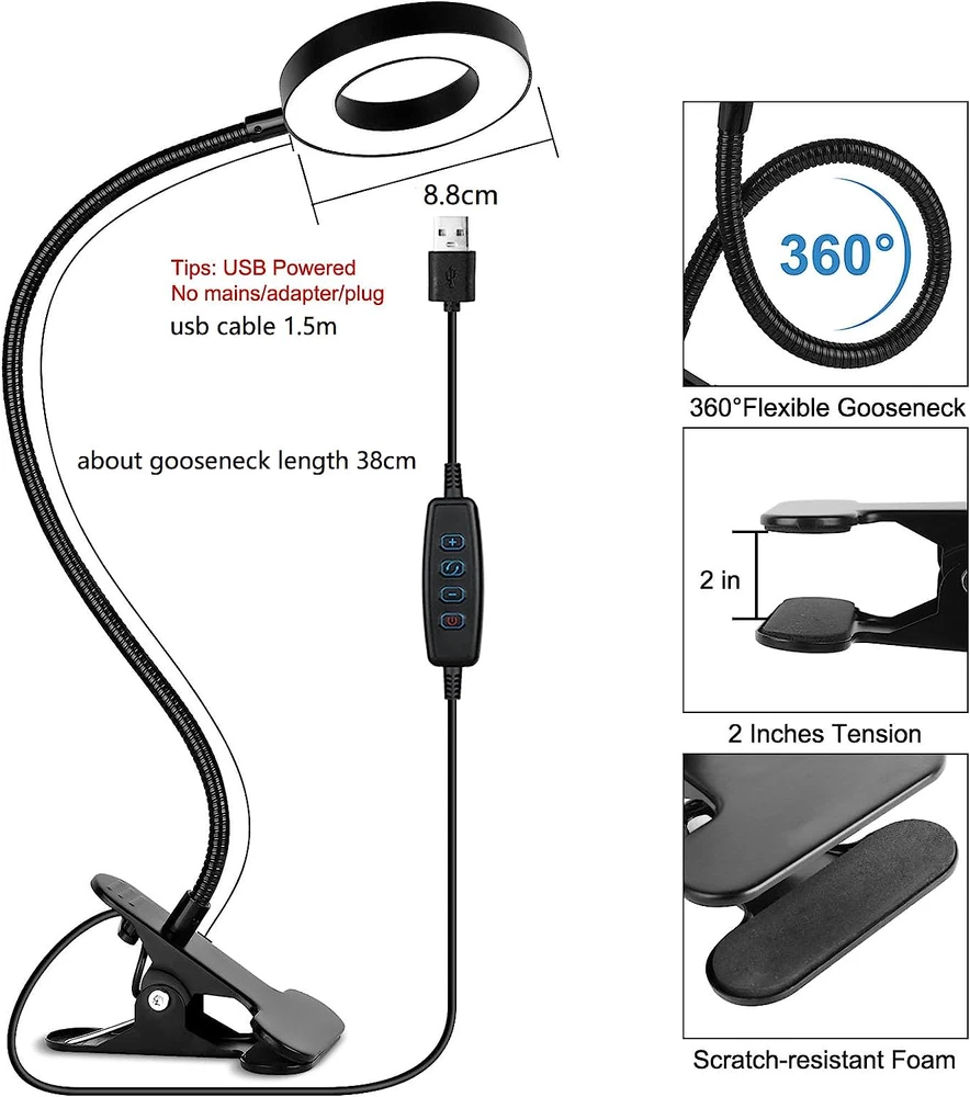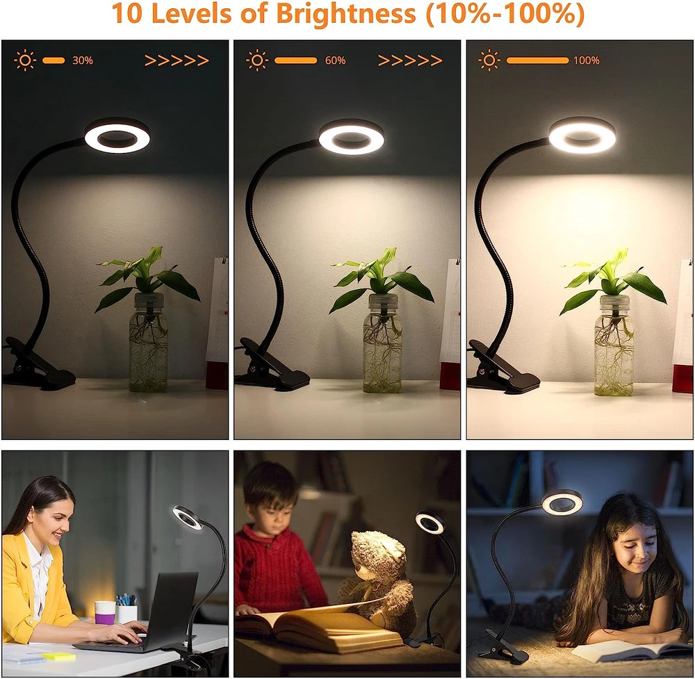 3 Light Modes and 10 Dimmable Brightness: Clip on lamp offers cool light, warm light, nature light and 10 brightness levels (10%-100%) for each lighting mode; Clip led lamp provides non flickering, no glare, no ultraviolet ray, no frequency radiation eye-friendly light to protects our eye from hurt; Ideal for home office, kids studying, hobby painting, lighting computer screen, sewing machine and work space so on Sturdy Clamp and Flexible Gooseneck Lamp: Clamp with scratch-resistant foam opens up to 5cm, which make clamp lamp perfectly clip to work table, computer desks, headboard, bedside, sewing table, different board and shelf, etc; 360°flexible gooseneck makes clip on light be bendy to any angles we need; Let's enjoy picture editing, bedside reading, dormitory study, painting, drawing, playing the piano, knitting wool, and all kinds of crafts! Memory and Auto Turn Off Function: Clip desk lamp can be set to turn off automatically after 1 minute; Then we can go back to the bed under the illumination of the clip on lights; And clip lamp will remember the brightness and mode of the last use until cutting off the power supply. USB Plug-in Powered Desk Lamp: The USB plug-in design makes charging more diversified. Tips: USB reading lamp, No mains; Clamp lamp can be powered by USB socket, power bank or laptop; And led lamp consume less power, suitable for kids, student (dormitory); The power button glows with a tiny blue light to make reading light easier for us to find. Small But Versatile Lamp: With simple design, small desk light is a great light filling thing; The diameter of reading lamp head is about 8.8cm, with about 5cm hollow in the middle; The round lamp head can illuminate more uniform light; The 2.6cm wide clamp that can opens to 5cm will take up very little space on the desktop and make the table more tidy; The whole body is about 50cm long, of which gooseneck is about 38cm long, of which usb cable is approx 150cm long. Product Description Dear friend, a 5V/2A adapter=power brick is recommended. Other power supply methods may make the product not work or work poorly. Happy Bed Reading Time! Have A Nice Video Conference! 3 Color Temperatures and 10 Dimmable Brightness Clamp to any 3-5cm desk, board... Free to adjust the lighting angle by Flexible Gooseneck Small But Versatile Lamp The video showcases the product in use. The video guides you through product setup. The video compares multiple products. The video shows the product being unpacked. More Uses Are Waiting for Us to Dig Out! clips on desk for home office Led Ring Light is also good for video conference lighting clips on headboard for reading clip on table for hobby craft clips on shelf, board Clip Lamp Memory Function : Clip light remembers the last mode and brightness you use until power is cut off. Automatic Switch off: Pressing the power button for about 2 seconds until the blue light flashes, then clamp lamp will auto turn off after 1 minute. Woputne desk lamp Add to Cart Add to Cart Add to Cart Customer Reviews 4.4 out of 5 stars 8,626 4.4 out of 5 stars 2,925 4.4 out of 5 stars 8,626 4.2 out of 5 stars 16 4.3 out of 5 stars 2,008 Price $9.99 $ 9 . 99 — $21.99 $ 21 . 99 — $17.79 $ 17 . 79 wattage 5 Watts 10 Watts 12 Watts 5 Watts 5 Watts Light Color Warm + Natural+Cool Warm + Natural+Cool Warm + Natural+Cool Warm + Natural+Cool+2 Colors Warm + Natural+Cool+2 Colors Color Temperature 3000/4500/6500K 3000/4500/6500K 3000/4500/6500K 3000/4000/5000/6000/6500K 3000/4000/5000/6000/6500K Features 3 Color Modes Double head and Tall Swing Arm + Focus Light+Tall USB Charging Port + Pen Holder Dual Head + USB Charging Port 10 Brightness Levels ✔ ✔ ✔ ✔ ✔