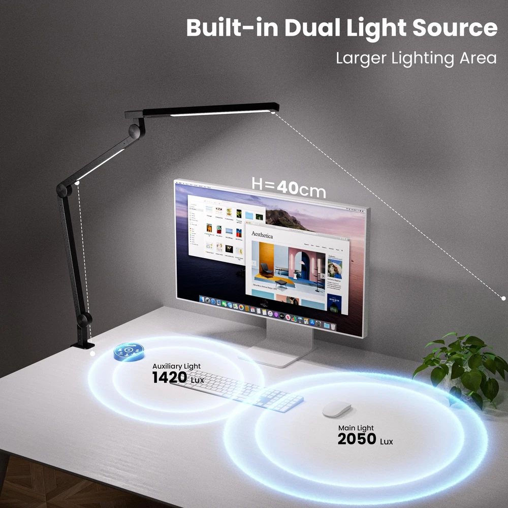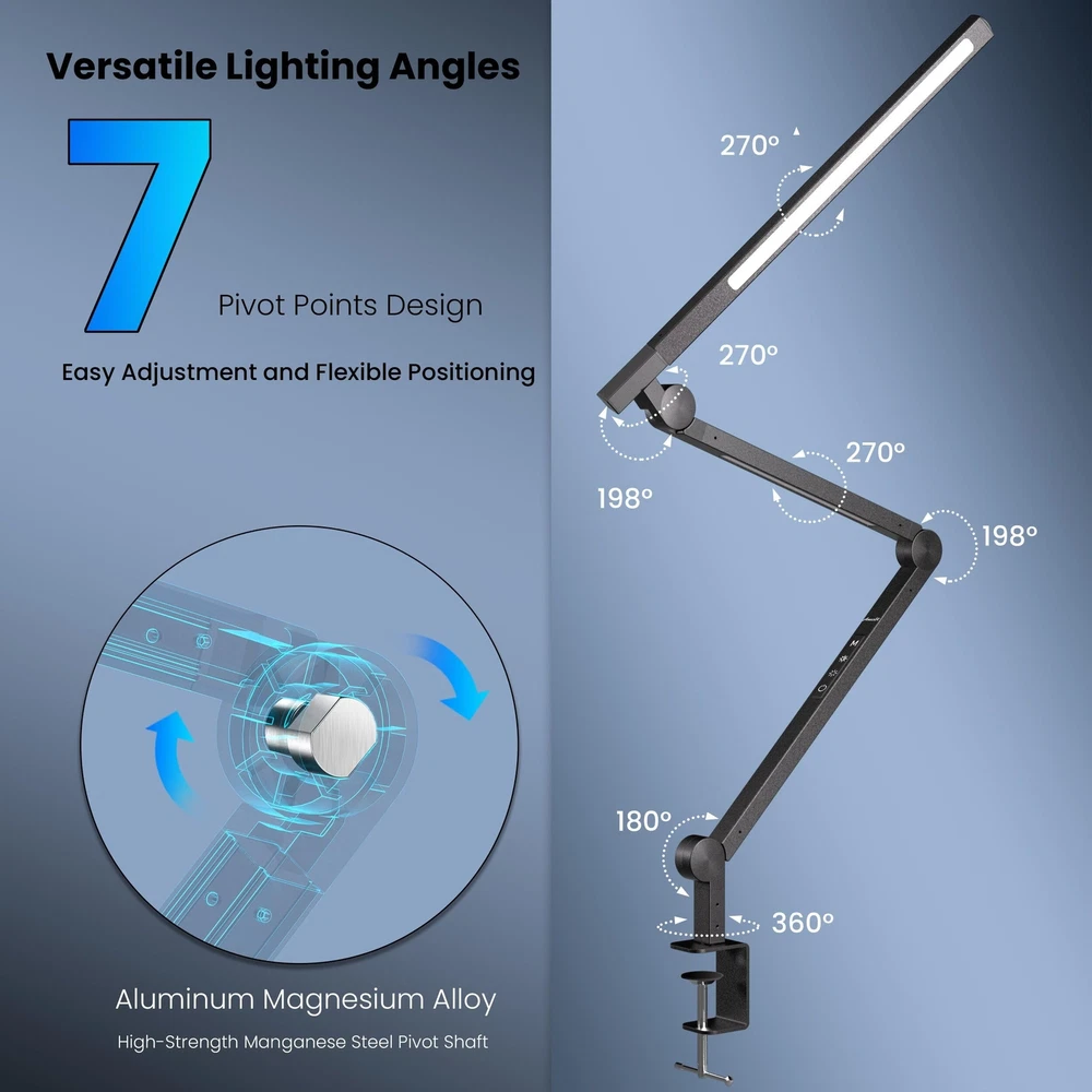❤ [Eye-care, Adjustable Brightness & Color Temperature] -- Dual light source provides decent brightness and various color temperature options. Flicker-free and glare-free illumination covers your entire desk area. 5 Brightness levels and adjustable color temperature (from 3000K to 5500K). Ideal for reading, working, thinking, relaxing, drawing, knitting, sewing, hobby, handicrafts, etc ❤ [4 Common Modes, Smart Remote Control] -- According to the usage habits of most people, we have set 4 common lighting modes. Reading Mode, 4000K & 100% Brightness. Relaxing Mode, 3000K & 100% Brightness. Working Mode, 5500K & 100% Brightness. Nightlight Mode, 3000K & 10% Brightness. Convenient remote control allows you full control of the lamp's various functions from anywhere in the room ❤ [Timer Function, Memory Function] -- We have built-in automatic delay-off function in the desk lamp. It can be set to 10 or 40 mins before sleeping, then it will turn off automatically. It is not necessary to worry about getting out of the warm bed to turn off the light. Compatible with wall switches and smart plugs. The light will be on/off instantly when you control the light via wall switch or smart plug. The lamp will return your last setting(mode) when you turn it on next time ❤ [Sturdy Metal Clamp, Flexible Long Swing Arm] -- Extra wide metal clamp comes with silicone pads. Strong clamp supports up to 2.7in/ 6.8cm desktop and holds the swing arm lamp securely in place. Saving space and keeping your desktop clean. With versatile 6-axis design, freely adjustable angles and multiple positions, you can adjust the light direction according to your personal need ❤ [Energy-efficient, What You Will Get] -- Highly efficient 154 LEDs consume 80% less energy than conventional incandescent bulbs and will last a lifetime of 50,000 hours. No need to worry about changing bulbs. 1x Desk Lamp (Material: Aluminum Alloy); 1x Remote Control; 1x UL Power Adapter (Cord Length:71 inches); 1x User Manual. A 180 days money-back and a 24-month worry-free warranty. Any questions, please contact our seller support via Amazon and we will reponse by the earliest time