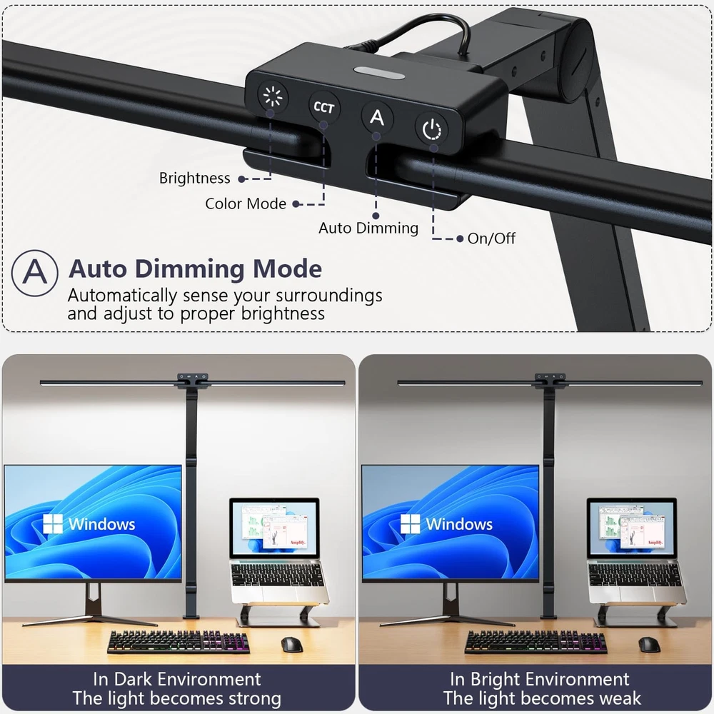 Store New Arrivals Add to Favorite View Feedback Contact Desk Lamp,Double Head Desk Lamp with Clamp,24W Led Desk Lights for Home Office Ultra Bright Architect Table Lamp 4 Brightness 4 Color,Auto Dimming Task Lamp for Monitor Work Study Description Item model number KB-ED-ME Light Source Type LED Style Modern double head desk lamp Number of Items 1 Power Source Corded Electric Number of Light Sources 2 Country of Origin China Bulb Features Dimmable Lighting Method Adjustable Mounting Type Tabletop Lamp Type LED Number of Pieces 1 Room Type Office Installation Type Clamp-onto desk Product Dimensions 2"D x 31.5"W x 27.5"H Material Aluminum Efficiency high Controller Type Touch Finish Type Painted Specific Uses For Product Indoor use only Color Rendering Index (CRI) 95.00 Indoor/Outdoor Usage Indoor Brightness 1000 Lumen Control Method Touch Water Resistance Level Water Resistant Batteries Required? No Item Weight 2.64 pounds Connectivity Technology AC Adapter Special Features 31.5 inch 24W super wide & bright double head desk lamp, Auto dimming mode for the most proper brightness, Fodable and flexible swing arms & 360° rotatable base, 30-min auto off timer, 2.14 inch metal C-clamp takes up no space and no gab between wall Special Feature 31.5 inch 24W super wide & bright double head desk lamp, Auto dimming mode for the most proper brightness, Fodable and flexible swing arms & 360° rotatable base, 30-min auto off timer, 2.14 inch metal C-clamp takes up no space and no gab between wall Part Number KB-ED-ME Shade Color White Color Temperature 6000 Kelvin Color Black Wattage 24 watts Is Cordless? No Base Material Metal Is Waterproof False Shape Desk clamp lamp with double heads Voltage 120 Volts Recommended Uses For Product Reading Shade Material Metal Finish types Painted Base Diameter 2.14 Inches Switch Type Touch 【Super Wide with Double Head】KableRika desk clamp lamp features double head with 31.5inch wide-spanning and 24w super bright lamp bars,make it a perfect light solution to illuminate entire large table or L-shape multi task desk evenly. And it also can be side lamp when the lamp heads arranged together for bright, targeted desk lighting. 【Stable & Foldable Swing Arm Lamp】The table light has 3 strongly damped joints swing arms for freely adjust the lamp over the monitor or bring closer to the work surface for sewing crafting etc. Its powerful support can steadily hold the lamp and won’t fall down. The 360°rotatable base allows the led lamp aim to any direction. 【Easy Operated Front Buttons】The buttons are designed in front of the Led light bar which is easy to see and reach when sitting and smooth to switch the light modes: 4 brightness levels and 4 color modes.【Auto Dimming Mode】Built-in Smart Lighting Sensor it will automatically sense your surroundings and adjust brightness to the most proper level. 【Space Saving Metal Clamp】This tall desk lamp comes with metal C-clamp allows the max desk wide 2.14-inch, it takes up absolutely no desk space and no gab between wall and desk, simple to mount onto desk to accommodate your different lighting needs: clamp onto the back of monitor or side of desk but not get in the way of monitors. 【CRI>95 Eye Caring & 30Min Timer】With high color rendering index LEDs(CRI>95), this office lamp provides constant flicker-free diffused lighting without eye strain, it lights up your work area but no-glare when you're reading on a computer screen. 【30-min auto off timer】long press power button till the light flash twice, the timer activates. Product Description 24W Double Head Desk Clamp Lamp with Swing Arms It has 31.5-inch and 24W ultra bright Led lamp bars, offer 1200LM lighting to illuminate every corner of your desk, the mount and height of this desk light is particularly applicable to fit over the multi-tasks workbench, dual monitors, wide curd monitors but not get in the way of monitors. Multi-Propose OverHead Desk Lamp and Flexible to Clamp-Onto Desk Your Lighting Solution for Home Office Swing Arms with Stable Joints & 360°Rotatable Base Equipped with strongly damped and 225°adjustable joints,make it stable support for lamp heads and flexible for working height (Max 26-inch), the 360°rotatable Base allows it aim to any direction that you want the lighting to. 31.5-Inch Wide Lamp Bar for Larger Coverage It has super wide length when the lamp bars are fully extended which will cover entire large table, and give enough lighting for your working space. Auto Dimming It will automatically sense your surroundings and adjust brightness to the most proper level. Space Saving C-Clamp Sturdy Metal Clamp-on Design takes less Desk Footprint,supports 2.14-inch max desktop thickness. Diffused Lighting Flicker-Free It delivers eye-friendly, and comfortable light that brightens up your desk space and reduces eye strain. 30-Min Auto Off Timer Long press the power buttons till the lamp flashes twice to activate the 30-min auto off timer. Wide Lighting Options, 1200LM Bright Enough KableRika Easy On The Eyes Desk Lamps for Home Office Add to Cart Add to Cart Add to Cart Add to Cart Customer Reviews 4.4 out of 5 stars 233 4.1 out of 5 stars 30 4.4 out of 5 stars 75 4.6 out of 5 stars 404 4.3 out of 5 stars 73 5.0 out of 5 stars 2 Price $46.99 $ 46 . 99 $43.99 $ 43 . 99 $43.99 $ 43 . 99 $39.99 $ 39 . 99 — — Power 24W 24W 12W 12W 12W Max 40W Lamp Bar 31.5-In double head desk lamp 31.5-In double head desk lamp 27-In double head desk lamp 27.8-In double head desk lamp 17-Inch wide desk lamp 3* E26 bulbs (not included) Lamp Pole foldable and stable swing arm foldable and stable swing arm highly flexible gooseneck highly flexible gooseneck highly flexible gooseneck tall standing pole Max Working Height 26-inch 23.2-inch 26.6-inch 24.6-inch 24.6-inch 67-inch Base Type 2.17-inch metal c-clamp Metal sturdy base Metal sturdy base 1.7-inch separated c-clamp 1.7-inch separated c-clamp sturdy metal base ABOUT US We offer the best prices around 