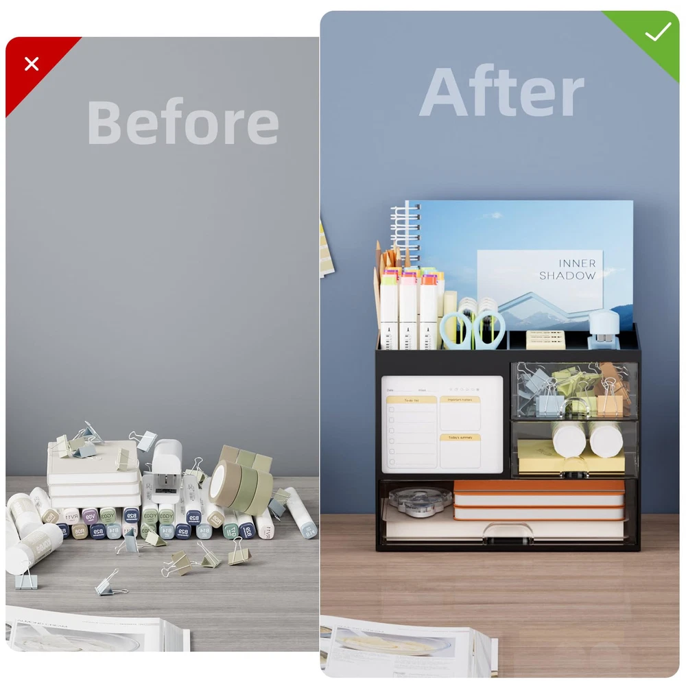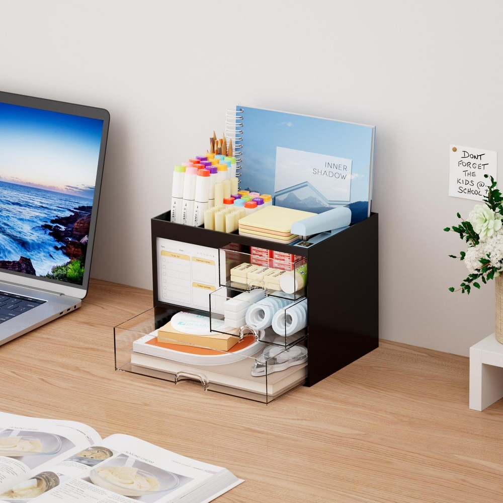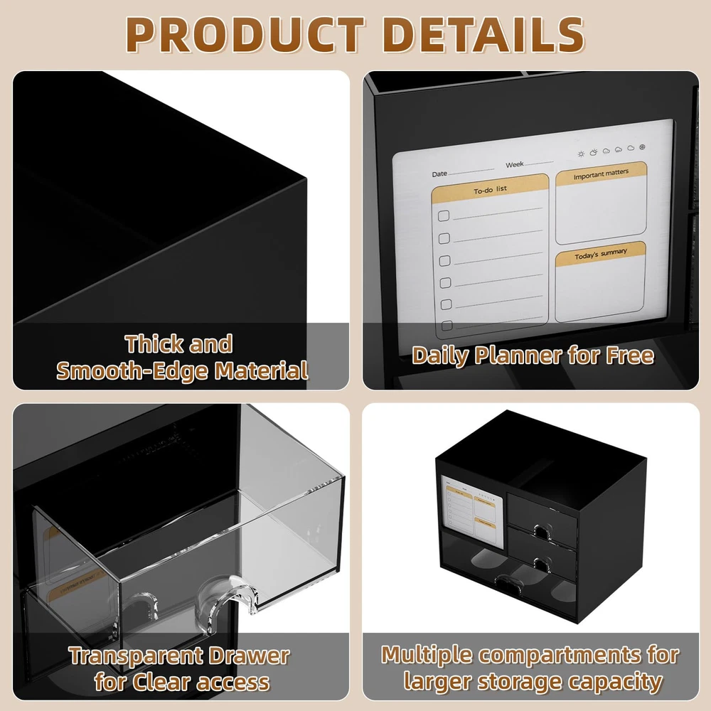 【Larger Capacity】Set of 2 compartments pen holder, 1 top tray, 1 notebook holder, and 2 drawers + 1 larger drawer organizer which has enough storage to allow for office supplies organization. Large capacity, multifunction help you arrange the desk accessories and stationaries clean and tidy.The best and safest storage option for you. Perfect Size:8*5.6* 6.1inch 【Daily Memo for Free】This humanized desktop storage box is not only perfect for storing your desktop stationery but also great for doing your daily schedule. In particular, the daily planner is placed in the most visible place on the desktop, which can serve as a more prominent reminder and help you work effectively 【Multifuction Desk Organizer】This Desk Caddy is no installation required not only perfect for storing your desktop stationery and many other desk widgets but is also great for storing your makeup brushes, nail polishes, lipsticks, and other small personal items sorted by type. The transparent drawer makes it way easier to find what you need! and You can put any other daily necessities on the organizer, It helps you keep your stuff organized 【Premium Material】This storage drawer organizer is crafted from durable ABS plastic, ensuring its strength and solidity for long-term use. The smooth operation of its drawers allows for easy opening and closing. Additionally, its waterproof design makes it effortless to clean, maintaining its pristine appearance over time 【Best Choice】The all-in-desk pen organizer be certain to bring our customers more convenience in the office and be popular in our daily life. If you have any questions, please feel free to us and we'll help to solve it in 24 hours. You take NO RISK by ordering today
