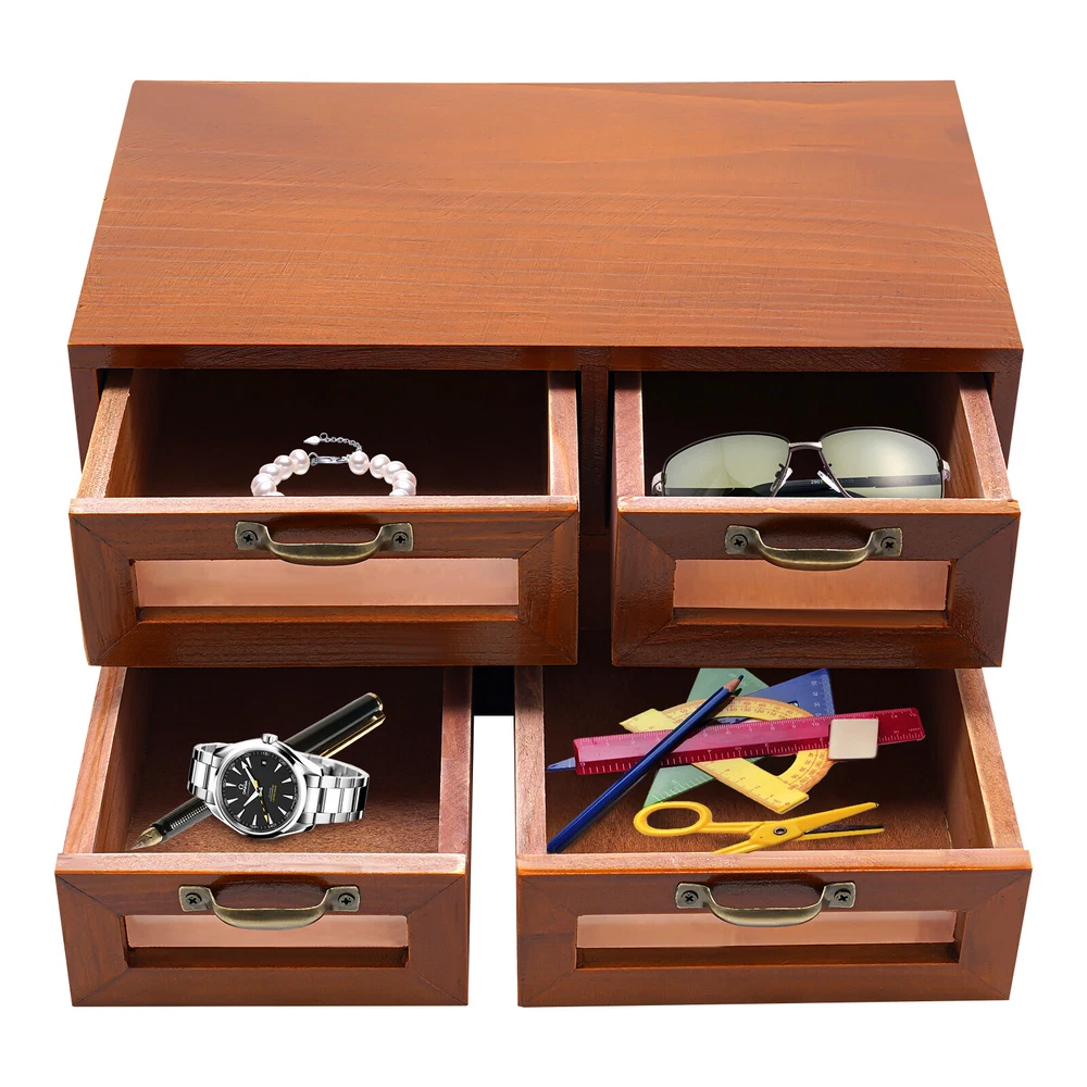 Package Included 1* Desktop Organizer 4* Drawers Specification Color: Dark Brown Style: Retro Shape: Rectangle Mount Type: Tabletop Material: Solid Wood, Plastic, Iron Assembly Required: No Number of Drawers: 4 Total Load-bearing Capacity: 4kg/8.82lbs Gross Weight: 1.8kg/3.97lbs Net Weight: 1.5kg/3.31lbs Large Drawer Width: 15cm/6in Small Drawer Width: 12cm/4.7in Package Size: 33*21*18cm/12.99*8.27*7.09in Overall Product Size: 30*18*15cm/11.8*7*6in Desk Organizer with Drawers Wooden Desktop Storage Cabinet Storage Box, 4 Drawer Welcome~ Application It can be placed on the dresser to store necklaces, earrings, bracelets, rings, crystals, cosmetics, perfumes, and lipstick, placed in the kitchen to store teabags, espresso coffee pods, sugar packets, placed in the living room to organize medicine, keys, watches, receipts, credit cards. It is also an office organizer to store electronics, small cords, chargers, batteries, pens, letters, staplers, and pictures. It is ideal for craftsmen to organize sewing pins, buttons, tool bits, and small precision tools. Package Included 1* Desktop Organizer 4* Drawers Specification Color: Dark Brown Style: Retro Shape: Rectangle Mount Type: Tabletop Material: Solid Wood, Plastic, Iron Assembly Required: No Number of Drawer s: 4 Total Load-bearing Capacity: 4kg/8.82lbs Gross Weight: 1.8kg/3.97lbs Net Weight: 1.5kg/3.31lbs Large Drawer Width: 15cm/6in Small Drawer Width: 12cm/4.7in Package Size: 33*21*18cm/12.99*8.27*7.09in Overall Product Size: 30*18*15cm/11.8*7*6in Description Do you feel annoyed by too many items on your desktop that are cluttered and unorganized? Our desktop organizer can help you solve this problem. It is made of high-quality material which ensures a long service life. The 4 drawers are convenient for you to organize different daily items. The handle makes it convenient for you to open the drawer. In a word, it can effectively help you reduce the pressure on your countertop, which is an ideal choice for you. Key Features Build to Last: The solid wood and plastic make it strong, hard to deform, resistant to corrosion, and environmentally friendly, so it can be used for a long time. Storage Assistant: 4 drawers allow you to organize and store cosmetics, jewelry (all are not included), and more. In addition, the top platform allows you to place toiletries, books (all are not included), etc., making your items neat and orderly. Retro Appearance: The dark brown color presents a retro style, adding beauty and vintage elements to your room. It plays a unique decorative role while using, bringing an old-world charm into your new-world home. Stable Construction: The thickened material and rectangular structure give it excellent stability and make it capable of supporting a weight of 8.82 lbs, meeting your needs for storing various items without tipping over. Effortless Cleaning: Thanks to the smooth surface and simple construction, you can easily wipe off the dirt on it with a soft cloth. Compact and Lightweight: The product is compact (11.8*7*6in) and lightweight (3.31 lbs), so you can effortlessly carry it or conveniently place it on various tabletops. Thoughtful Gift: This is an ideal gift for colleagues, friends, and family to help them organize their belongings and keep their desks tidy. Protective Package: To prevent the product from being damaged during transportation, we packed it with bubble bags to protect your products to the maximum extent possible. Good Customer Service: We stand behind all our guests and look forward to assisting you with your purchase. It is our pleasure to answer your confusion and questions. The end of the story between us is not "we sell and you buy". Details Convenient Handle: The iron handle is durable and makes it convenient for you to open the drawer. Smooth Edge: The rounded and smooth edges not only add to the aesthetics of the product but also improve the safety of use. Notes Please note that this product does not include any other items. Please check the size carefully before ordering. Please do not place it in a damp place or near an ignition source. Please allow the slight color difference caused by the shooting light and the 1-3 cm error due to manual measurement, and make sure you do not mind before ordering. tu1 Payment Delivery details Terms of sales About us Contact us Payment We accept ebay payment 。 Fees such as import duties, taxes are not included in the item price or shipping costs. These charges are the buyer's responsibility. Delivery details Shipping: 2-9 working days to: USA Terms of sales We maintain high standards of excellence and strive for hundred percent customer satisfaction. Feedback is very important to us. We hope that you contact us immediately before you give neutral or negative feedback, so that we can address your concerns. It is impossible to address issues if we do not know about them! About us Your satis faction is our ultimate goal. We work hard to earn your trust and future business. Our certified technicians have tested each item before shipping. The unit comes with 1 year limited warranty on all manufacturing defects. a) If you receive a defective item, you may return it or ask for a discount. Please contact us within 14 days after you receive the package. b) What you returned must be intact and in its original packaging as re? u. Customer is responsible for shipping costs of the returned item. c) We will cover the cost of shipping back t with the shipping rate indicated in the registration page. We will send you a new unit or refund the full payment you paid. Thank you. Contact us Business Hour Business Hour: Monday To Friday: 8:30 AM to 5:00 PM (Beijing China time) Due to time zones, our reply to your questions may not be immediately. But within above working time, we will reply your email within 24 hours. If it's non-workdays, please kindly be patient and wait till Monday. Please contact us with ebay message. Please feel free to contact us if you have any questi