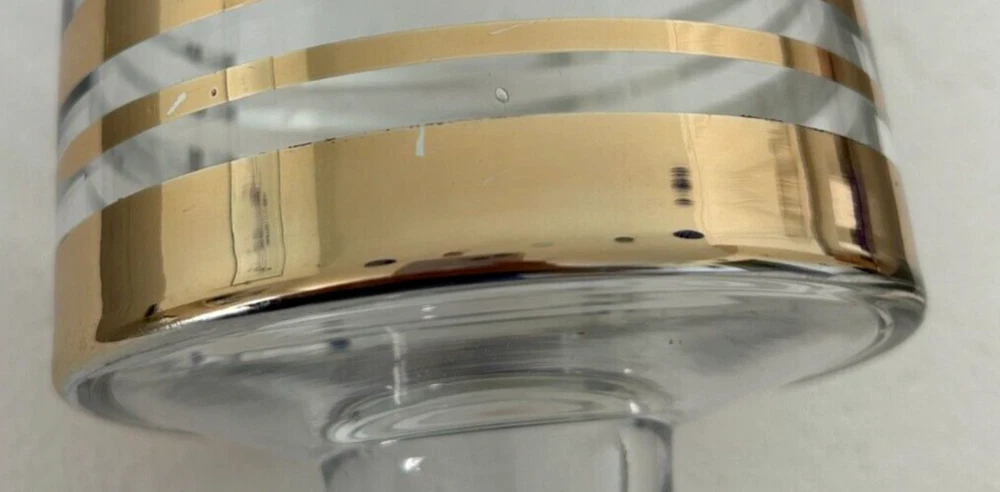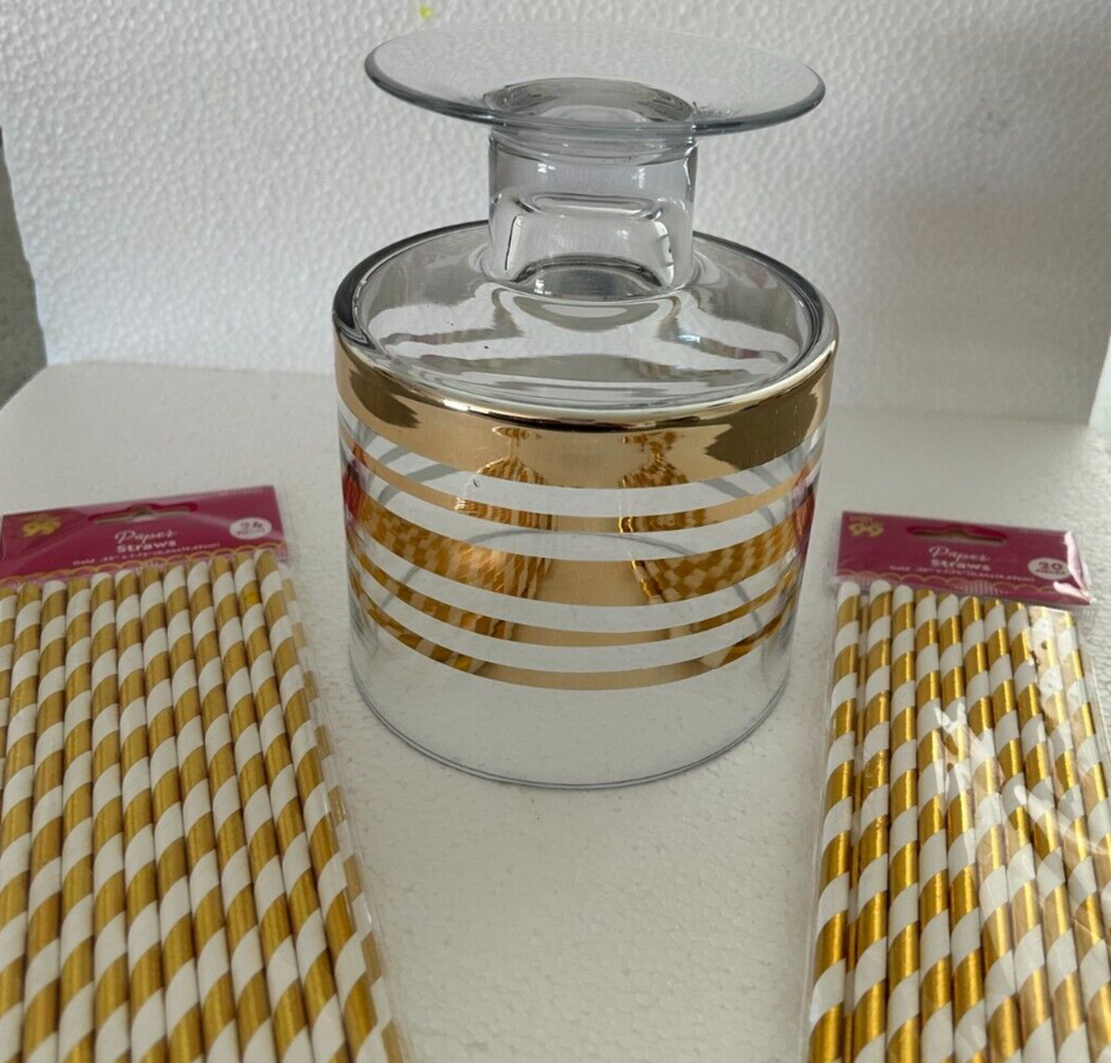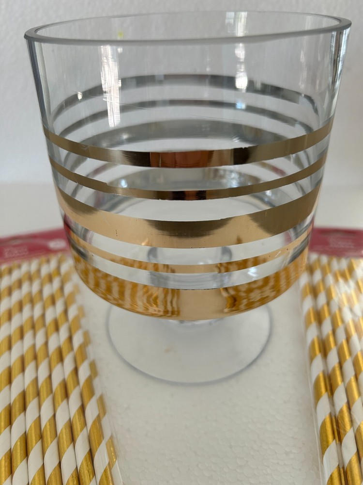 Decorative footed glass dessert bowl or trifle bowl with gold rings 6"h x 5 "w + Bonus 48 Paper Straws gold-white