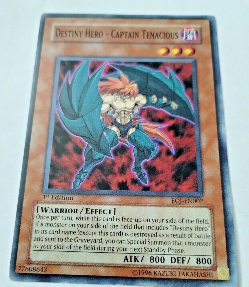 Language:EnglishCard Type:NormalFeatures:1st Editionbrand:KonamiManufacturer:KonamiGame:Yu-Gi-Oh! TCGAdditional Description:Destiny Hero - Captain TenaciousCard Name:Destiny Hero - Captain TenaciousAttribute/MTG:Color:DarkSet:Enemy of JusticeAttack/Power:800Level:3Defense/Toughness:800Card Text:When this card is face up on your field, when a monster that have [D-Hero] in its name on your field is destroyed as a result of battle and send to graveyard excluding this card, Special Summon that monster on your field in your next standby phase. You can use this effect only 1 time for 1 turn.Creature/Monster Type:WarriorCard Number:EOJ-EN002Rarity:Common / Short Print