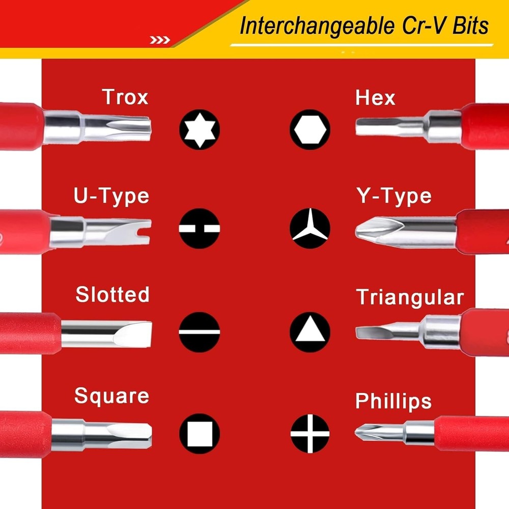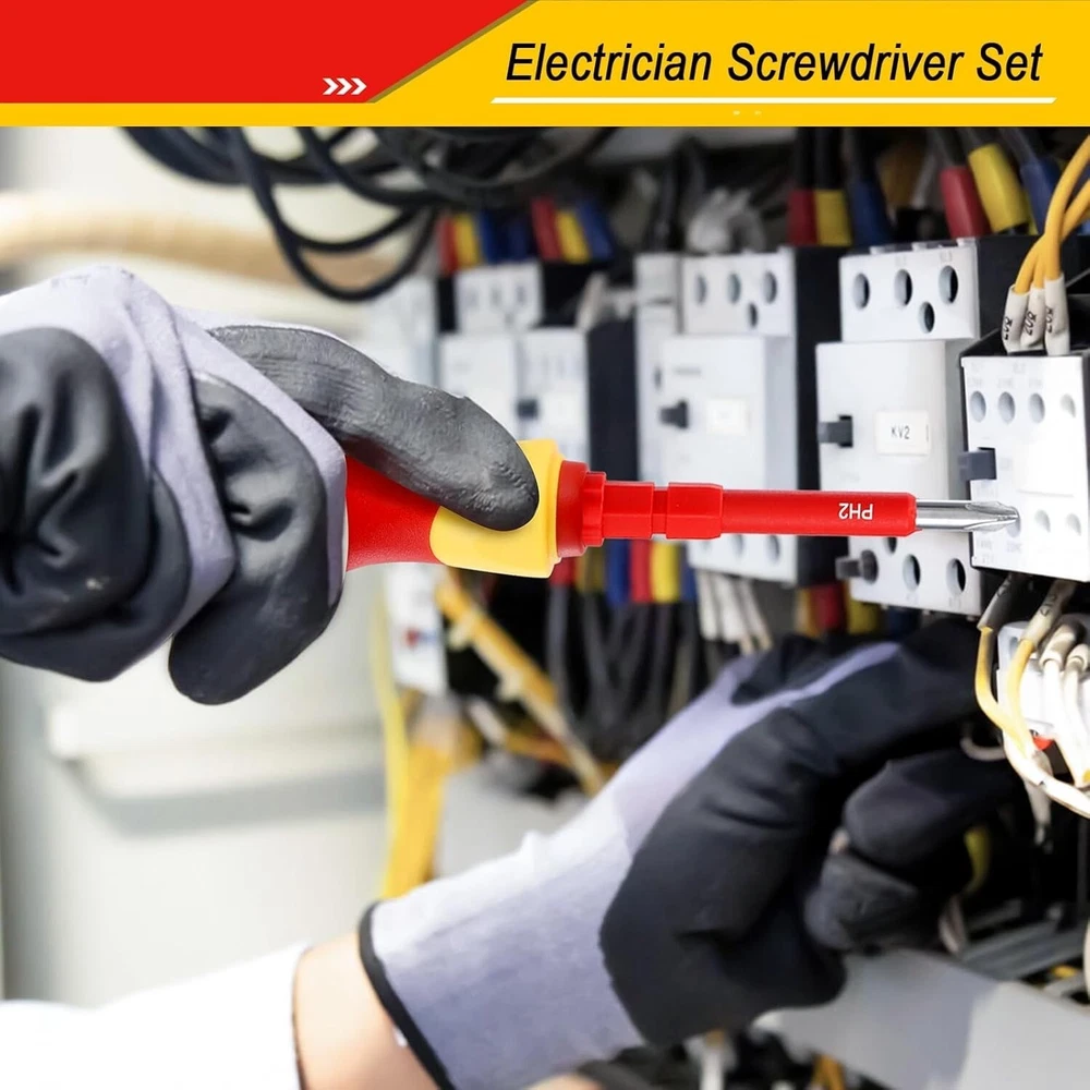 Destornilladores Aislados 1000V Herramientas Para Electricistas Electricidad Set Juego de destornilladores 29 en 1: Incluye caja de almacenamiento y 14 hojas intercambiables: 4 cuadradas, 5 ranuradas, 5 Phillips, 5 Torx, 2 en forma de U, 2 triangulares, 2 tipo Y, 3 hexagonales, 1 comprobador de voltaje y 1 mango extraíble. Certificado de seguridad: El material aislante y el estándar de aislamiento de 1000 V han sido certificados por VDE y GS. Destornilladores aislados que garantizan su seguridad. Juego de destornilladores magnéticos: Todas las puntas de los destornilladores están hechas de acero al cromo vanadio y tratadas magnéticamente para lograr una mayor dureza y un magnetismo más fuerte, adecuadas para trabajos de electricistas profesionales y proyectos de bricolaje en el hogar. Cómodo de usar: El mango ergonómico lo hace más cómodo durante un uso prolongado. Los destornilladores se insertan con precisión en la ranura del mango, sin preocuparse de que la hoja se afloje o se caiga, lo que aumenta la seguridad durante el uso. Ampliamente utilizado: Ya sea que trabaje en campos eléctricos, el automóvil, el barco o en proyectos domésticos, este juego de destornilladores aislados le ofrecerá la precisión que necesita. El mejor regalo para esposos, padres, artesanos y metalúrgicos.