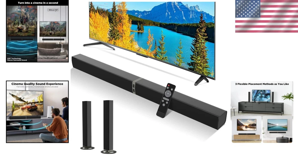 Detachable 32-Inch 60W Soundbar with Advanced DSP for Crystal-Clear Audio ‹ › ‹ › ‹ › ‹ › ‹ › ‹ › ‹ › ‹ › Detachable 32-Inch 60W Soundbar Transform Your Home Entertainment Experience Key Features: 360° Surround Sound: Enjoy a cinematic experience with four advanced drivers that deliver precise sound reproduction, bringing every detail from whispers to explosions to life. Advanced DSP Technology: Experience high-fidelity audio with our cutting-edge DSP technology, minimizing sound transmission loss and delivering crystal-clear sound free from distortion. Elevated Audio Performance: Splits into two sleek tower speakers for a dynamic vertical audio arrangement, enhancing your listening experience while adding a contemporary flair to your decor. Seamless Setup: Effortless installation compatible with Optical, ARC, AUX, and Bluetooth connections, ensuring integration across all your devices. Reliable Support: Your satisfaction is guaranteed with life-time after-sales service, and swift support within two days if needed. Benefits: Immerse yourself in crystal-clear audio that revitalizes your movies and music. Customizable sound profiles tailored for every occasion: news, music, or movies. Innovative design that seamlessly enhances your home decor. All-in-one package with everything you need for quick and easy installation. Why Choose Our Detachable Soundbar? Dive into an exhilarating audio journey that elevates your home entertainment to new heights. Our 32-Inch 60W Soundbar offers more than just sound; it immerses you in every scene, ensuring that your favorite movies and music resonate with clarity and depth. Discover the joy of a truly cinematic experience from the comfort of your home. Don't wait—embrace the power of exceptional audio quality today and revolutionize your TV audio! Shipping Free & Fast Shipping - We offer free shipping to most of the USA with a normal delivery time of 3-7 days. However, due to the current situation, additional delivery time (up to 3 weeks) may be required for some items. Alternative Carriers - We may use alternative carriers (e.g. USPS, FedEx, UPS, etc.) to ensure your package arrives safely and on time. Due to the use of multiple carriers, we are unable to provide a tracking number automatically. Handling Time - Orders are processed and shipped within 1-2 business days of receiving cleared payment. Shipping Restrictions - Shipping to Alaska, Hawaii, Puerto Rico, Guam, and other US territories may incur shipping charges or delivery restrictions. Please contact us before ordering, or your order can be refunded/cancelled. State Restrictions - There may be restrictions based on your state of purchase. For example, certain items may not be shipped to California due to state regulations. Contact for Tracking Updates - If you require tracking updates or have any concerns about the delivery of your order, please feel free to contact us, and we will be happy to assist you. Return Please see our eBay Return Policy. Thank you. Payment We accept all major credit cards, PayPal, and Apple Pay for your convenience. Your payment information is secure and encrypted to ensure a safe and seamless transaction. Please complete your payment within 3 days of purchase to avoid any delays in shipping. Feedback Your feedback is extremely important to us. We strive to provide the best products and customer service possible. If you are satisfied with your purchase, please take a moment to leave us a positive review. If you have any concerns or issues with your order, please contact us before leaving negative feedback. We are committed to resolving any problems and ensuring your satisfaction. Contact Us If you have any questions or concerns, please feel free to reach out to our customer support team. You can contact us through the eBay messaging system. We are available Monday to Friday, 9:00 am to 5:00 pm EST, and we will do our best to respond to your inquiry within 24 hours. Thank you for supporting our small family business! UPC: Not Set Unit Quantity: 4.77 pounds Item Height: TV Sound Bar Item Length: TV Sound Bar Item Width: TV Sound Bar Connectivity: Bluetooth,ARC,Optical,AUX Features: Design,360° Surround Sound,Advanced DSP Technology,Elevated Audio Performance,Seamless Setup,Reliable Support Audio Inputs: AUX,ARC,Optical Smart Home Compatibility: Not Set Surround Sound Formats: Not Set Compatible Brand: Not Set Compatible Model: Universal,Smart TV,Computer,Smartphone,Tablet,MP3 Player,Desktop,Projector,Laptop Brand: Unbranded Type: Soundbar Model: TV Sound Bar Shape: Rectangular System Configuration: 4.1 Channel Color: Black RMS Power: 60 W Driver Size: Dynamic Driver Impedance: 8 Ohms MPN: Not Set Unit Type: Unit Material: Plastic Year Manufactured: Not Set Country/Region of Manufacture: Not Set Plug Regional Fitment: Not Set Manufacturer Warranty: Not Set Battery Capacity: Not Set Item Weight: 4.77 pounds