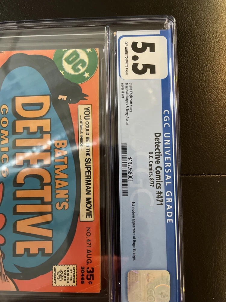 This Detective Comics #471 from DC Comics 1977 features the first modern appearance of Hugo Strange, a villainous character in the Batman universe. The comic book includes appearances from other characters such as Alfred Pennyworth, Thomas Wayne, Martha Wayne, Joe Chill, Rupert Thorne, and Silver St. Cloud. The issue number 471 is part of the Bronze Age (1970-83) era and is graded as a 5.5 Fine- by the Certified Guaranty Company (CGC). The cover artists are Marshall Rogers and Terry Austin, with Steve Englehart and Terry Austin as the writer and artist, respectively. The comic book is in English language and has a tradition of US Comics.