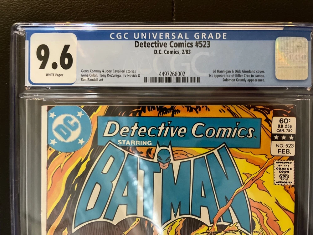 This is a rare and valuable comic book from the Bronze Age of comics. It features the first printing of the first cameo appearance of Killer Croc in the DC Universe, along with other iconic characters such as Batman (Bruce Wayne) and Solomon Grundy. The cover artists include Ed Hannigan and Dick Giordano, and the writers include Gerry Conway, Ron Randall, Gene Colan, Bill Willingham, and Dick Giordano. The comic book is professionally graded by the Certified Guaranty Company (CGC) and has a grade of 9.6 Near Mint+. It was published by DC Comics in 1983 and is part of the Detective Comics series. This comic book is a must-have for any serious collector of US comics and is a valuable addition to any collection.