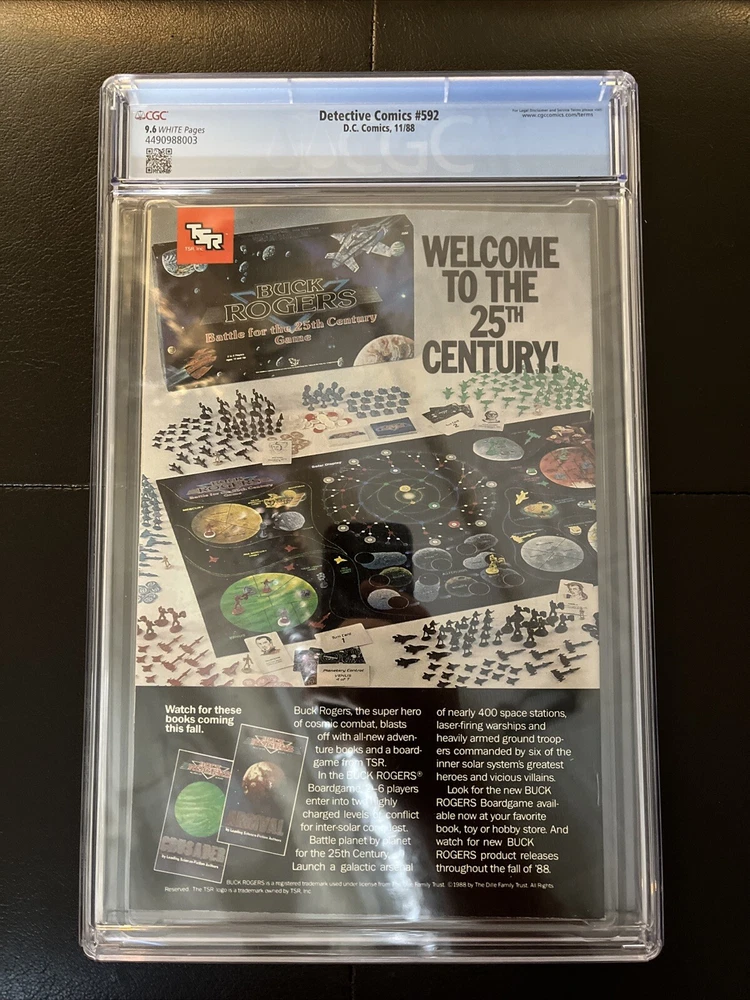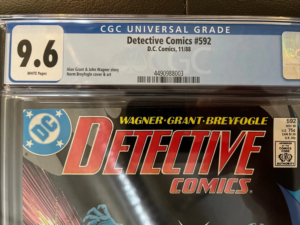 Format: Single Issue Language: English Character: Batman (Bruce Wayne) Tradition: US Comics Publication Year: 1988 Series Title: Detective Comics Issue Number: 592 Professional Grader: Certified Guaranty Company (CGC) Grade: 9.6 Near Mint+ Era: Copper Age (1984-1991) Type: Comic Book Publisher: DC Comics Artist/Writer: Alan Grant, John Wagner, Norm Breyfogle