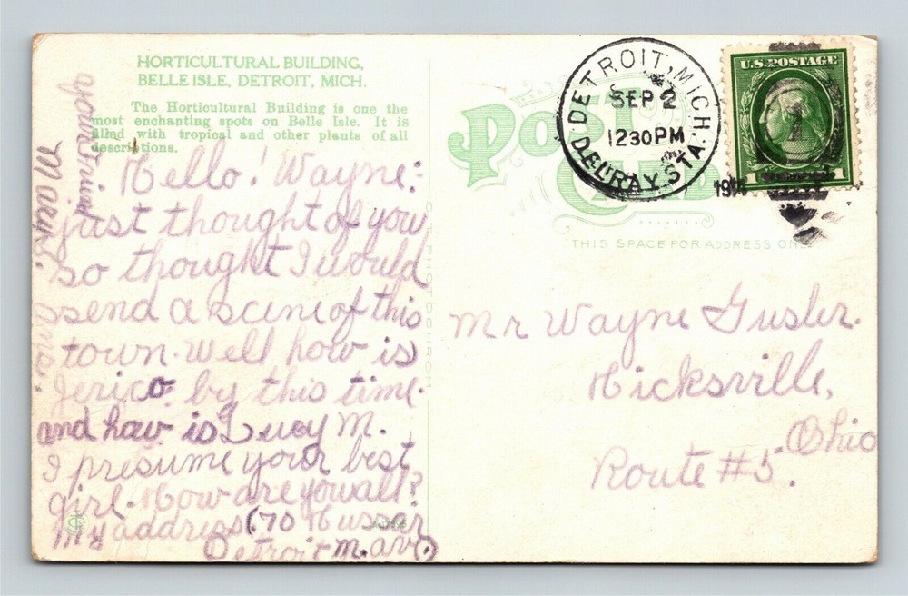Detroit MI Belle Isle Horticulture Building Vintage 1914 Postcard
