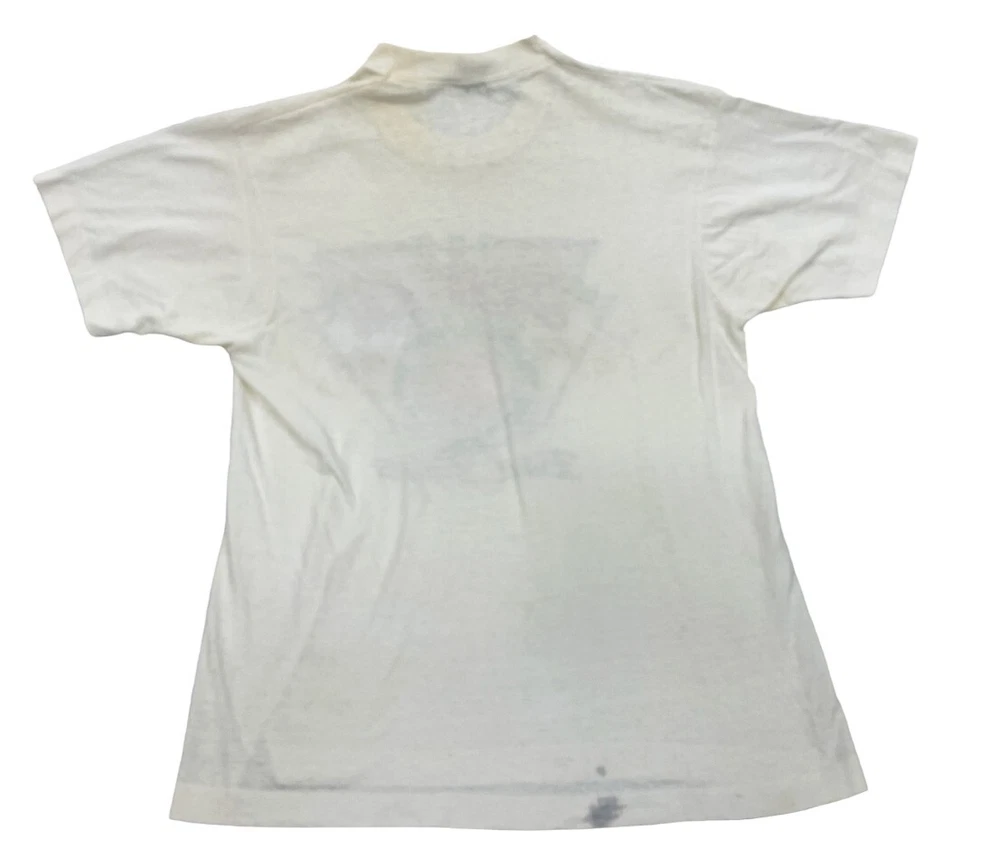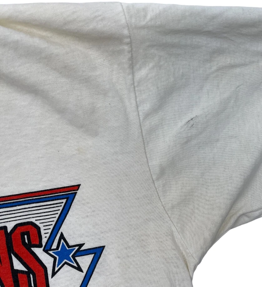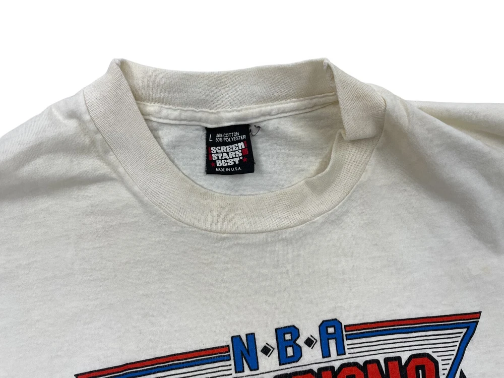 Sleeve Length: Short Sleeve Material: Cotton, Polyester Vintage: Yes Department: Men Size Type: Regular Graphic Print: Yes Type: T-Shirt Brand: Screen Stars Pattern: Print Theme: NBA, Vintage Color: White Fit: Regular Size: L Neckline: Crew Neck