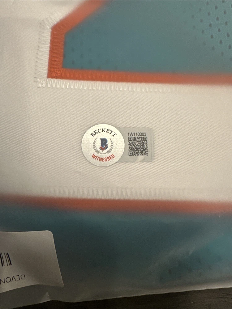 Elevate your collection with a Devon Achane autographed custom Miami Dolphins jersey. This piece is a must-have for any avid football enthusiast or collector. The signature is verified by Beckett Authentication Services, ensuring its genuineness and adding significant value to the item. Crafted with care, this jersey represents both the spirit of the sport and the excellence of the Miami Dolphins. The autograph adds a personal touch from rising star Devon Achane, making it a standout addition to any memorabilia showcase. Own a slice of football history with this authenticated and signed jersey.