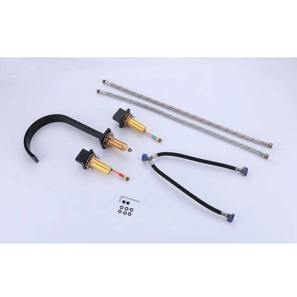 [additional] Included: Spout Valve (2 units) with handles "T" to connect valves and spout Hose for valve and spout connection. 1/2 inch female NPT 12 inch length (2 units) Installation accessories Qty: 1 Documents: Spec Sheet (.PDF) [/additional] Contemporary and elegant bathroom faucet with two valves. Design of flat square lines that makes it worthy of being inside our Luk 2 family, a series of modern style bathroom accessories.This faucet includes classic straight lines for an attractive but substantial style that provides an elegant bathroom sensation. The characteristics of graceful style and without complications give this taps an eternal but fashionable presence. Adapted but relaxed. This brilliant collection works perfectly with current lifestyles. The handles make it easy to adjust the water. Clear laminar flow provides a beautiful waterpresentation. Tap handles can be installed at any distance between 8 in. and 16 in. for more customized extended installation.Available in different finishes. Features: Widespread faucet 8 to 16 inch installation Ceramic cartridge 3/4 inch Flow rate: 1.2 gpm @ 60 psi / 4.5 Lmin @ 414 kPa Deck thickness: Max 1 inch Hose included for valve and spout connection. 1/2 inch female NPT 12 inch length Available in different finishes. Material: Brass Finish/Color: Matt Black Dimensions: W: 10" * H: 9.5" * D: 7.5" Weight: 4.4 lb. Rustproof: Yes Warranty (Years): 1 Material Warranty: Yes Finish Warranty: Yes UPC Certified: Yes Easy Installation: Yes