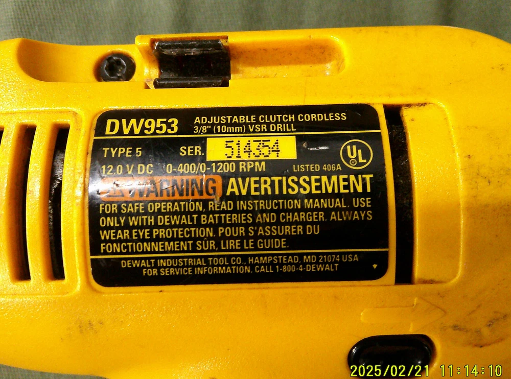 You are purchasing a Dewalt 3/8" 12V Drill DW953 No Battery $29.95 OR MAKE AN OFFER! WE ship to the lower 48 states only!!! Any E-mail questions asking to ship otherwise WILL NOT receive a response. We do not offer combined shipping. High value items arrive signature REQUIRED. Please have someone available to sign for your package. Insurance & signature required . Check out my other items! FEEDBACK Please take the time to leave feedback once you have inspected your item. On the rare occasion you are not satisfied, PLEASE contact us. We want to ensure you are another satisfied customer. All pictures are actual items unless otherwise stated. If something is not pictured it is not included in the listing. We work very hard to make sure our listings are accurate and all items function properly. WE DO NOT ACCEPT RETURNS so if you have a question please ask before purchasing.