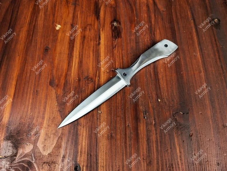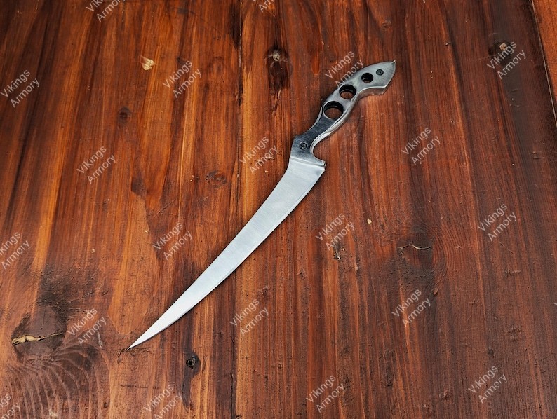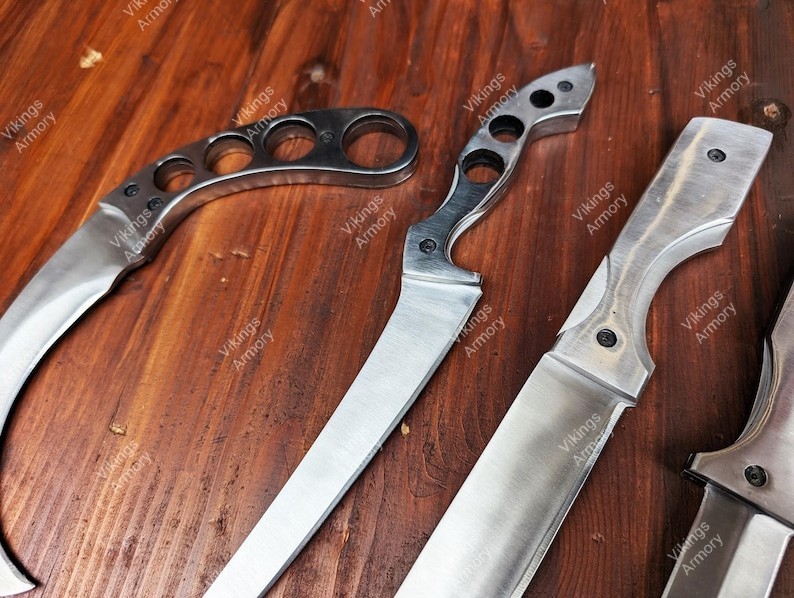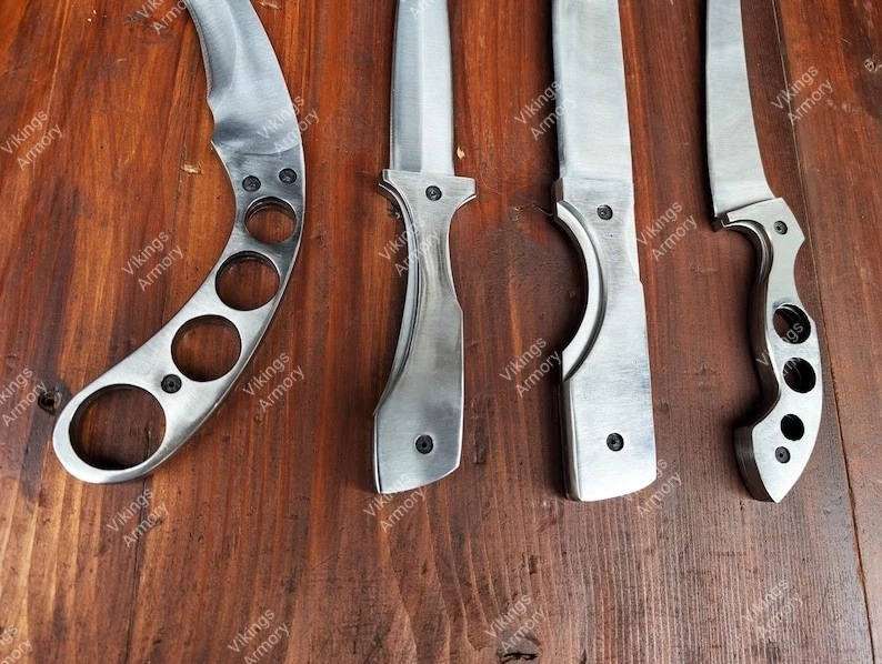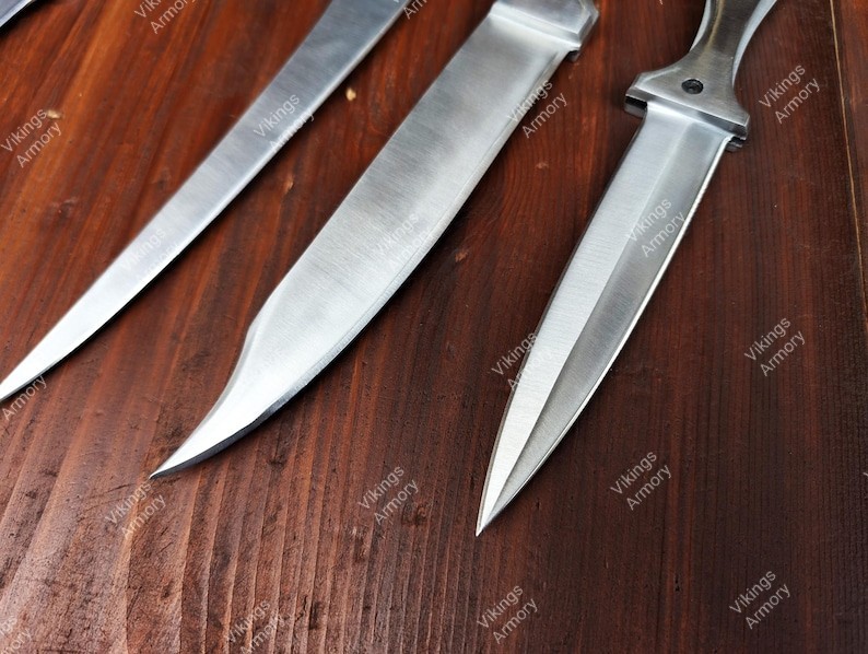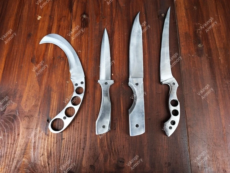 Dexter Morgan Knives: Custom Dexter k-ill Tools 4 Pieces Set Replica | Gift For Men | Birthday gift | Collectable knife | Gift For Him | Movie prop | Personalized Knife | Birthday Gift | Anniversary Gift | Christmas Gift | Wedding Gift | Outdoor Knife | Hunting Knife | Groomsmen Gift Knife | Best Men Gift | Dexter Series knife The Dexter's Hero Knife is a must-have for any Dexter enthusiast, a real showpiece in your collection. Whether you're a fan of the original series or New Blood, this knife is a tangible connection to the world of Dexter Morgan. DIMENSIONS & MEASUREMENTS: K-ill Knife Overall Length: 13 Inches Blade Length: 7.75 Inches Handle Length: 5.25 Inches Materials : Blade Material: Stainless Steel Handle Material: Steel Fillet Knife Overall Length: 14.5 Inches Blade Length: 9.5 Inches Handle Length: 5 Inches Materials : Blade Material: Stainless Steel Handle Material: Steel Dagger Knife Overall Length: 10 Inches Blade Length: 5 Inches Handle Length: 5 Inches Materials : Blade Material: Stainless Steel Handle Material: Steel Karambit Overall Length: 11 Inches Blade Length: 6.5 Inches Handle Length: 5 Inches Materials : Blade Material: Stainless Steel Handle Material: Steel Leather Sheath: Premium Leather Roll will be provided. Care Instructions : Sharpness Warning: Due to the exceptional sharpness of our blades, please handle with utmost care. Natural Material Care: To preserve both the blade and the leatherwork, avoid using water-based products on the blade or the leather handle and sheath. Blade Maintenance: We recommend using linseed oil to treat the blade. Linseed oil helps prevent rust and corrosion. Apply a thin coat to the clean, dry blade and buff off any excess. Leather Care: To maintain the leather handle and sheath, you can use a natural leather balm containing beeswax periodically. Apply a small amount of balm and buff it gently into the leather. Sharpening: For sharpening your knife, we recommend using either carborundum or diamond sharpening stones.