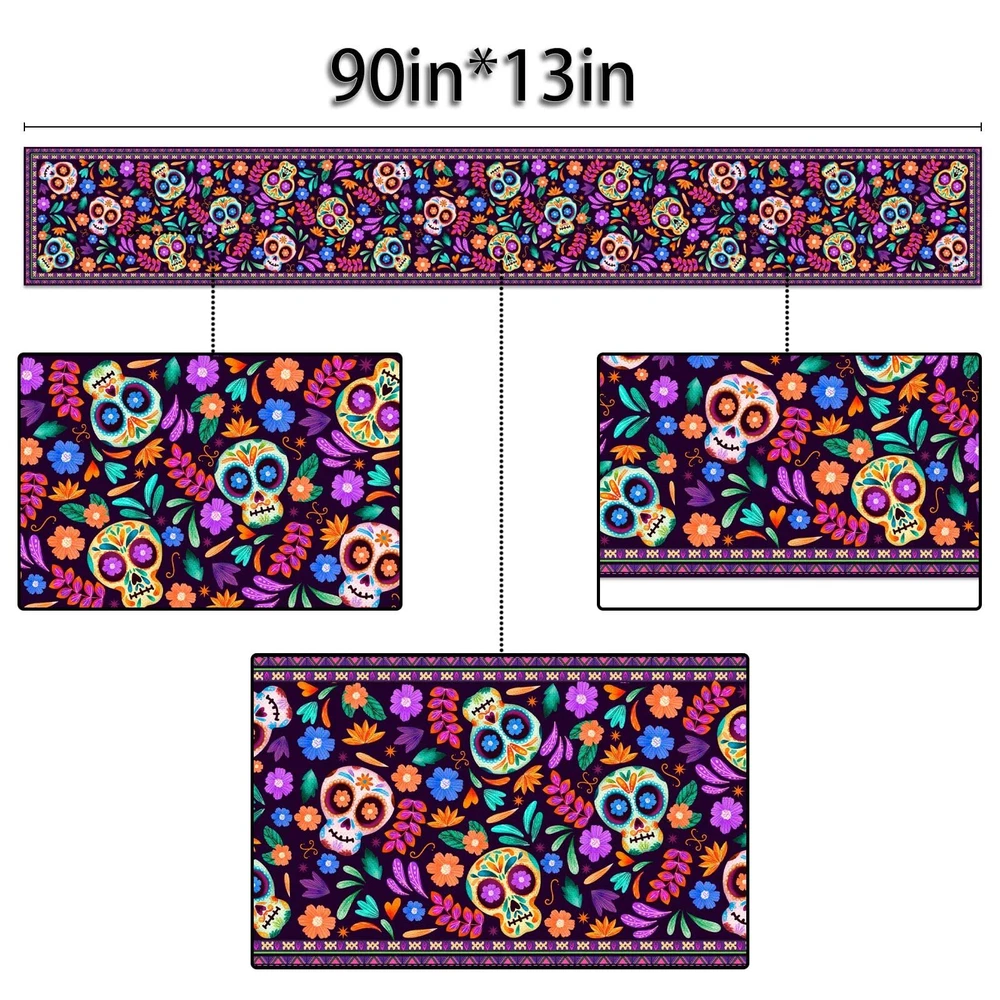 Material: 100% linen fabric, no shrink, no fading. Package listing: 1pc table runner. Size:13×90inch(33×228cm). Suitable for a table that can seat 4 to 6 persons. Easy to Clean : Hand washable and lay the table runner flat to dry. Perfect for Day of The Dead altar kitchen dining room daily use. Also for Mexico Cinco de Mayo holiday and special events celebration party decoration.
