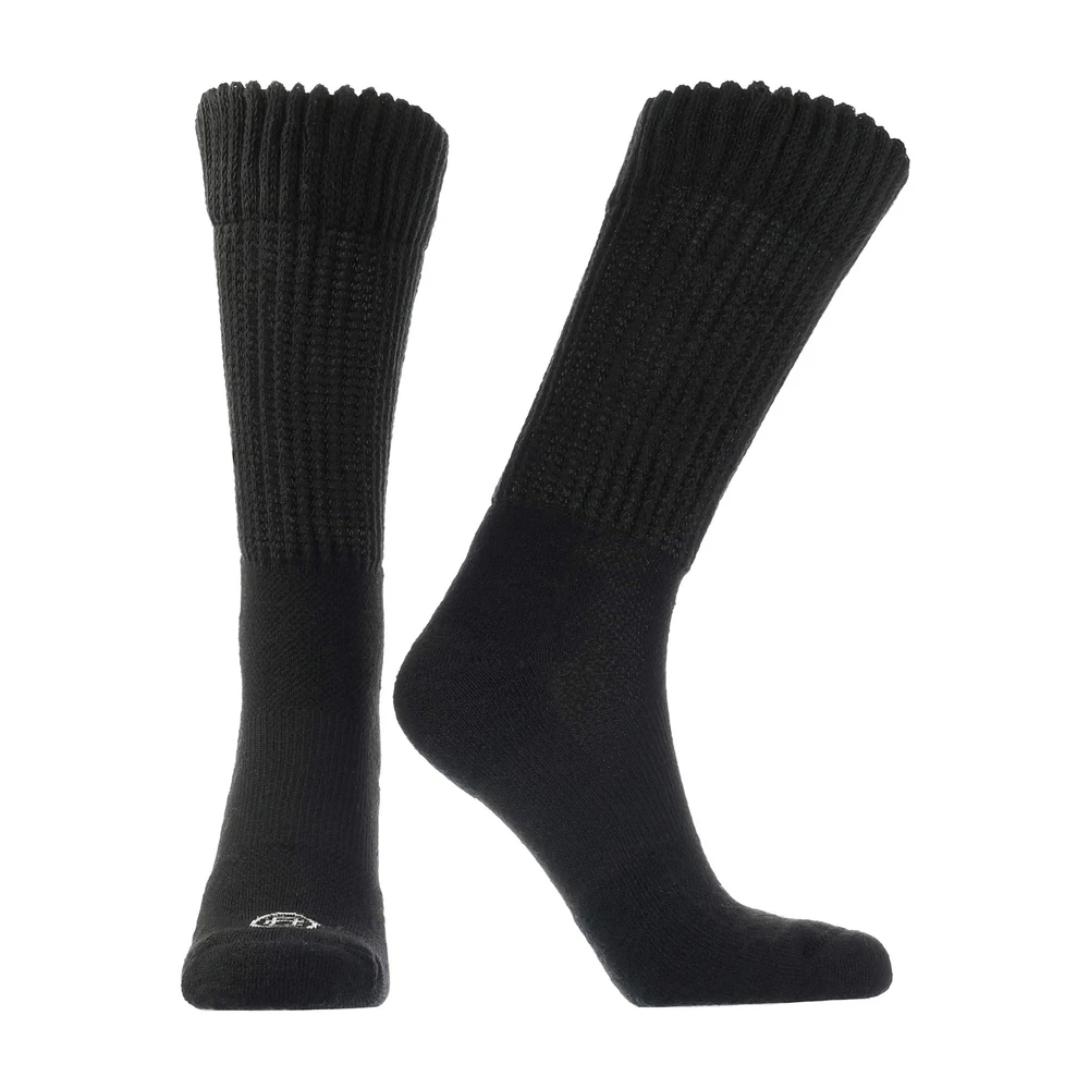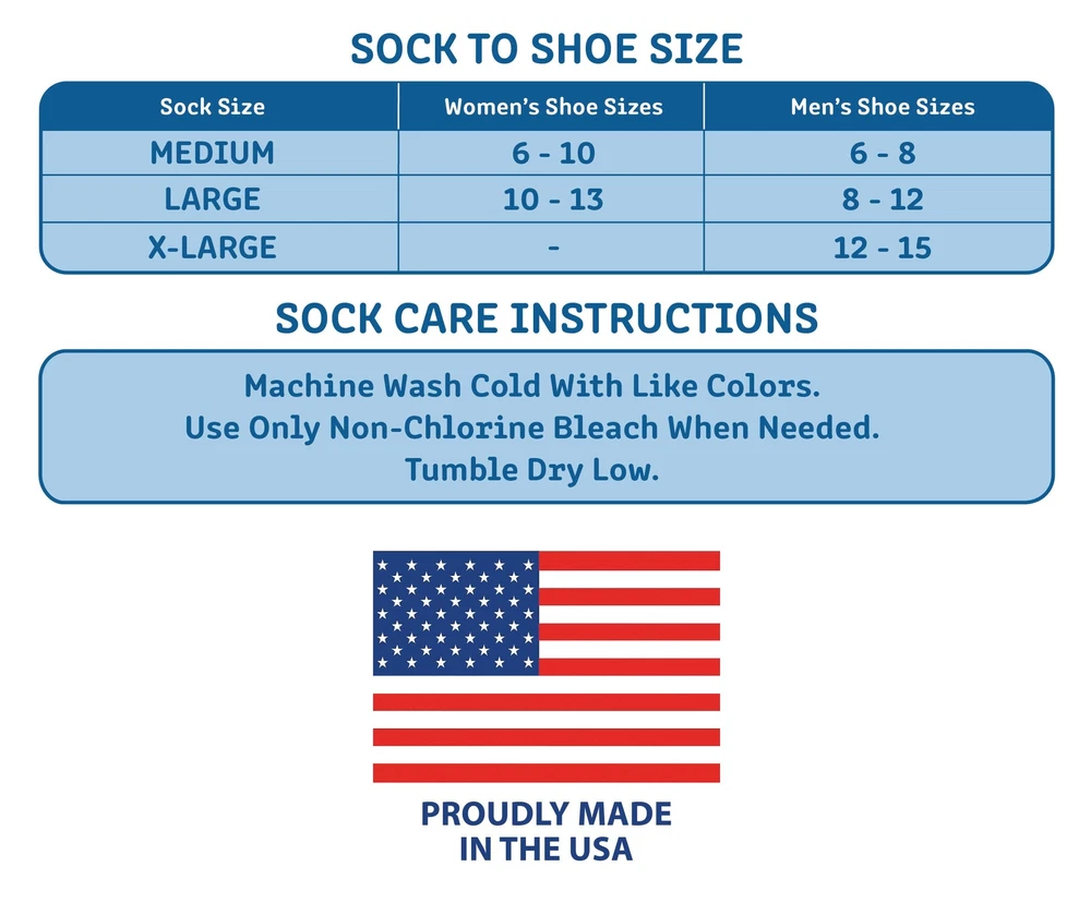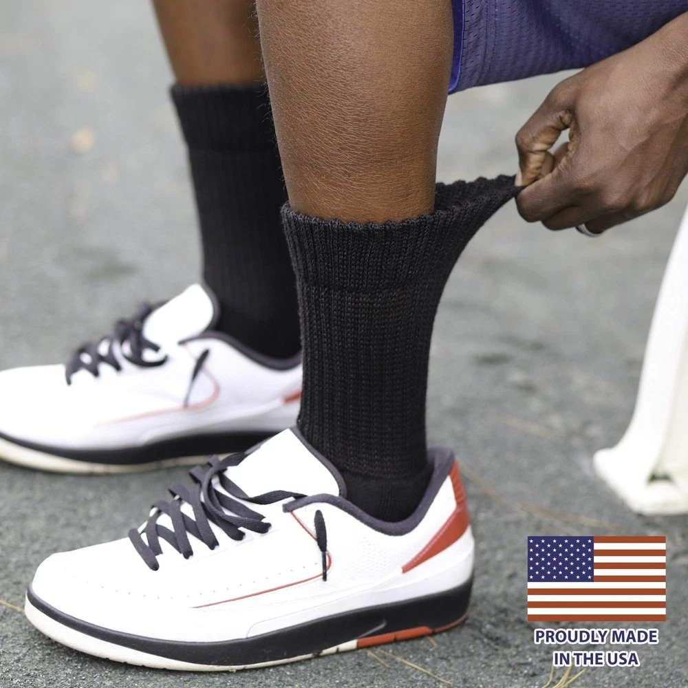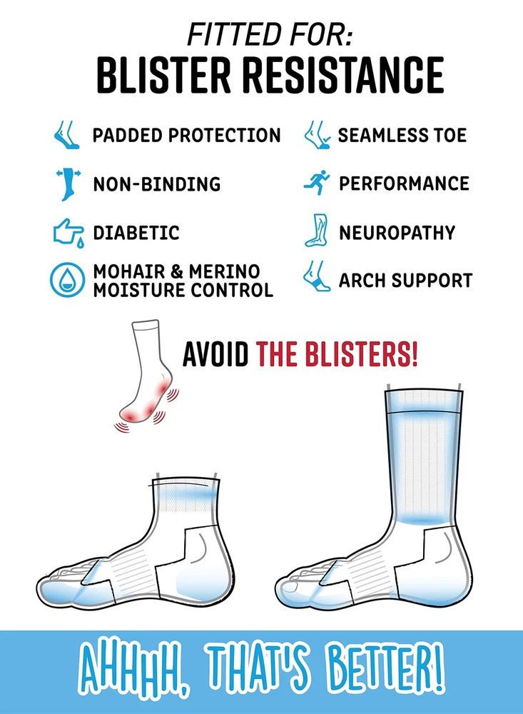 An important part of leading a healthy lifestyle is staying fit and active. What do you do when you have an issue that makes it difficult to go for a long walk or pick up that tennis racket? Are you a diabetic in need of a performance sock that resists blisters and protects your feet? The Crew Socks for Blister Resistance combines anti-friction mohair and pure merino wool provides the ultimate moisture management fabric to keep your feet dry. Dense terry fabric cushions and protects the high impact areas. Arch support and a seamless toe prevent bunching and abrasion. The non-binding, easy stretch top provides comfort and easy circulation. Great for those who play tennis, pickleball, golf, or go bowling, walking, jogging, and hiking. AVOID DANGEROUS BLISTERS: Diabetic athletes are highly susceptible to blisters due to limited circulation and the moisture and abrasion generated when working out. Blisters are especially dangerous for diabetics with peripheral neuropathy if blisters go undetected and become infected. Prevention is key and it is paramount that socks fit well, move moisture, cushion the foot and do not bind the leg. SAFE, DRY & COMFORTABLE: Loose tops, strategic padding, moisture wicking, & limited friction are key features needed in performance diabetic socks. Our blister resistance socks feature anti-friction mohair & wool combined into a quarter-length sock that provides the ultimate moisture management fabric to keep feet dry. Arch support & a seamless toe prevent bunching & abrasion. The non-binding, easy stretch top provides comfort & easy circulation. FEEL BETTER, PLAY BETTER: Mohair and Merino wool fibers absorb moisture and release it as vapor for a drier feel than other fabrics. You'll feel equipped for competition the moment you put them on, and you'll marvel at how great your feet feel after every exercise. PERFORM WITH CONFIDENCE: Whether it's cardio tennis, pickleball, hoops or a run, you'll experience the best of a performance sock built with the necessities of a diabetic sock. Trust your feet will stay dry and protected no matter how long or intense the workout. MADE IN THE USA: diabetic active socks are made of 71% Polyester, 12% Nylon, 7% Mohair, 7% Merino Wool, 2% Rubber, 1% Spandex. Medium: Men's Shoe Size 6-8. Large: 8-12. X-Large: 12-15.
