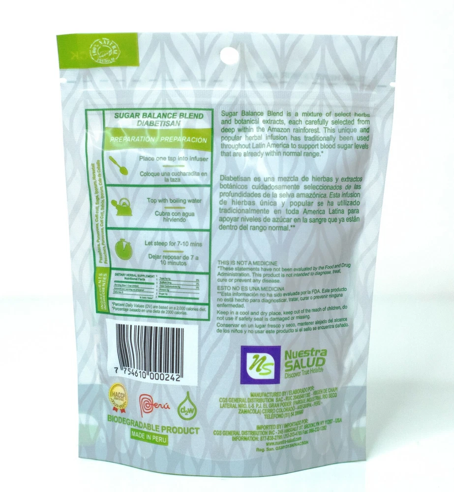 Diabetisan Sugar Balance Herbal Infusion Tea Zip-Lock Bag (40g) Presentamos el té de hierbas Diabetisan Sugar Balance, una mezcla elaborada para respaldar niveles saludables de azúcar en la sangre. Procedente de la exuberante selva amazónica de Perú, este té combina el poder natural del diente de león, la pasuchaca y las hojas de yacón. El diente de león es conocido por su potencial para ayudar a la digestión y la salud del hígado, mientras que la pasuchaca se utiliza tradicionalmente por sus propiedades antidiabéticas. Las hojas de yacón añaden un toque de dulzura sin aumentar el nivel de azúcar en la sangre, lo que hace de este té una opción sabrosa y beneficiosa para quienes buscan el equilibrio. Disfrute de una taza de Diabetisan y saboree la combinación armoniosa de las bondades de la naturaleza. Diente de Leon – Dandelion ( Taraxacum officinale ) Hojas de Yacon – Yacon leaves ( Smallanthus sonchifolius ) Pasuchaca ( Geranium dielsianum) Superior Blends There’s an art to collecting and drying herbs; a technique passed down through Peruvian culture for centuries. We lean on this ancient knowledge to keep the potency of the herbs we collect at its peak. Our herbs are picked and packaged in their whole and unfiltered form to deliver the transformative nutrients just as Mother Nature intended: pure and simple. Next Level Freshness Taste the enchanting character of the Peruvian coast, angelic Andes, and majestic jungle. Our Peruvian herbal teas are diligently packed in zip-lock bags to tightly seal in the freshness and deliver enticing flavor with every sip. Whether you’re starting your day, re-charging your afternoon, or relaxing away in the evening, freshness will always be part of the equation. Discover the Variety Taste the enchanting character of the Peruvian coast, angelic Andes, and majestic jungle. Our Peruvian herbal teas are diligently packed in zip-lock bags to tightly seal in the freshness and deliver enticing flavor with every sip. Whether you’re starting your day, re-charging your afternoon, or relaxing away in the evening, freshness will always be part of the equation.
