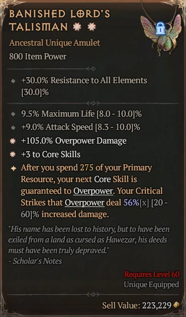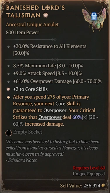 Diablo 4šŸ”„Season 7 SoftcorešŸ”„Banished Lord's Talisman Unique Amulet HIGH Rolls