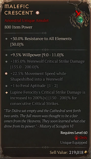 Diablo 4šŸ”„Season 7 SoftcorešŸ”„Malefic Crescent DRUID Unique Amulet HIGH Rolls