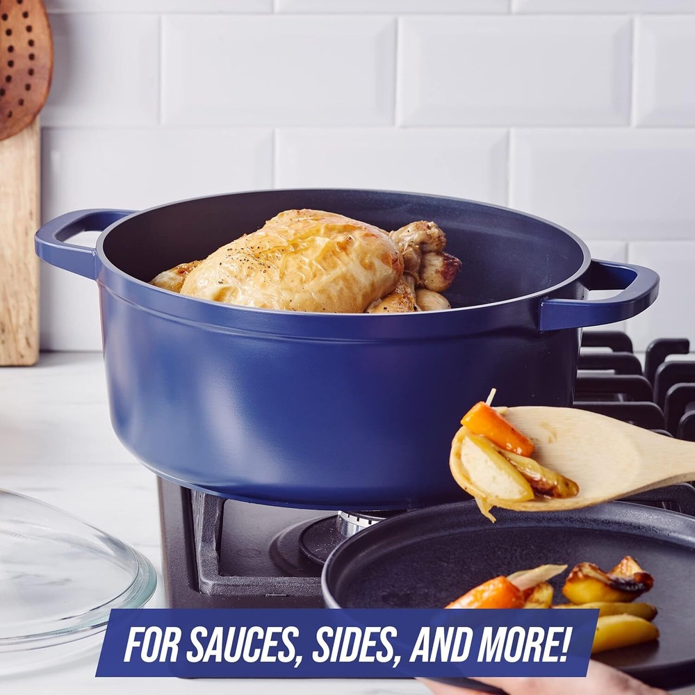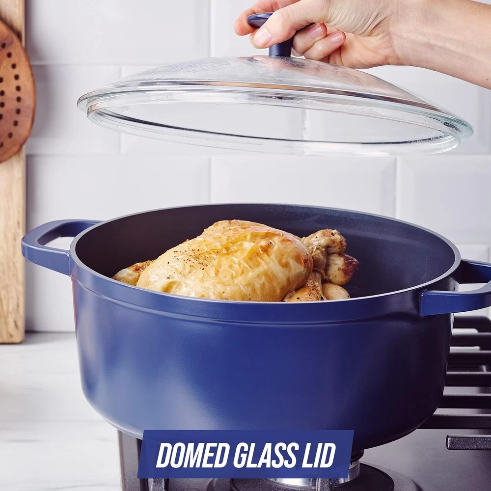 Forged Aluminum Construction: 50% lighter than cast iron with all the performance. Blue Diamond’s Signature Diamond-Infused Ceramic Nonstick: The ultra-durable diamond-enhanced ceramic coating is 5x harder and 10x longer lasting then traditional nonstick coatings, making it scratch-resistant and metal utensil safe Toxin-Free: Free of PFAS, PFOA, lead, and cadmium Cook & Look Dome Lid: This temperature shock-resistant cast glass lid gives you an easy look at your meals without losing heat The dutch oven rounded dome lid provides 85% more room than a traditional lid and promotes better airflow Huge Capacity—Fits a whole chicken! Oven and broiler safe up to 600°F, glass lid up to 350°F Dishwasher Safe For all stovetops, except induction Limited Lifetime Warranty