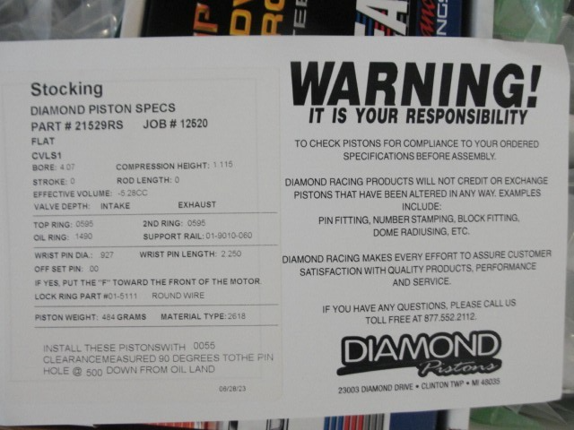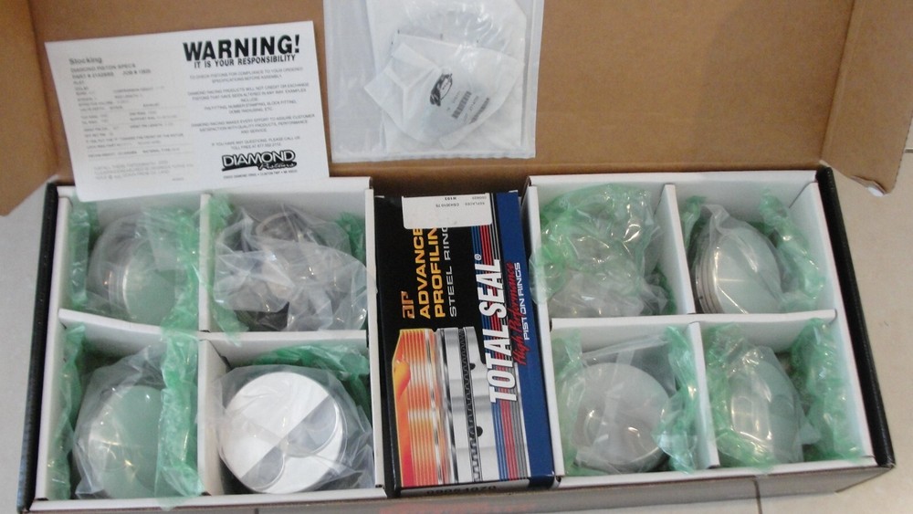 Selling a new set of Diamond LS2K 4.070x4.00in Flatop Pistons 416ci - 12 degree reliefs(work great on 11-13.5 degree heads) -.250 pins - Moly Coated Skirts - 6.125 Rod - 1.2/1/2/3mm rings - Total Seal Rings included Extremely nice set of pistons, some of the best on the market for a LS build. These are rated to 2000hp from Diamond. Email with any questions before you buy. Thanks for looking and check my other items for more great LS parts!