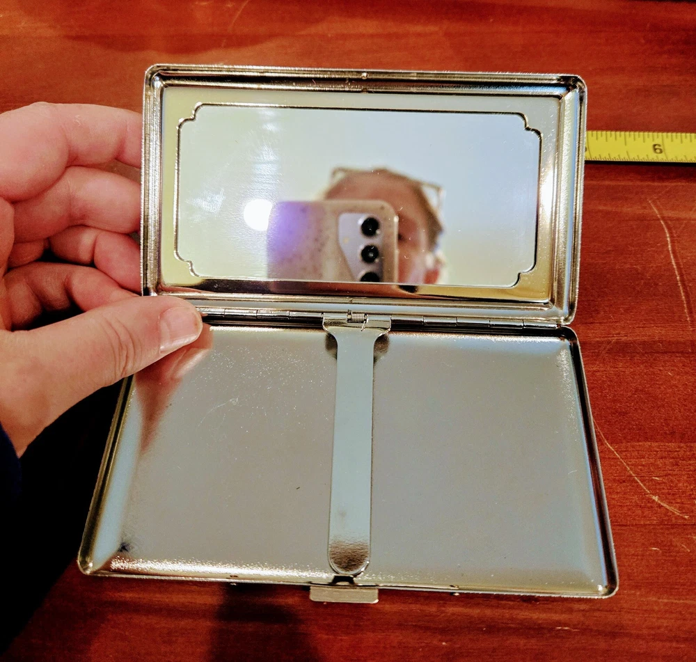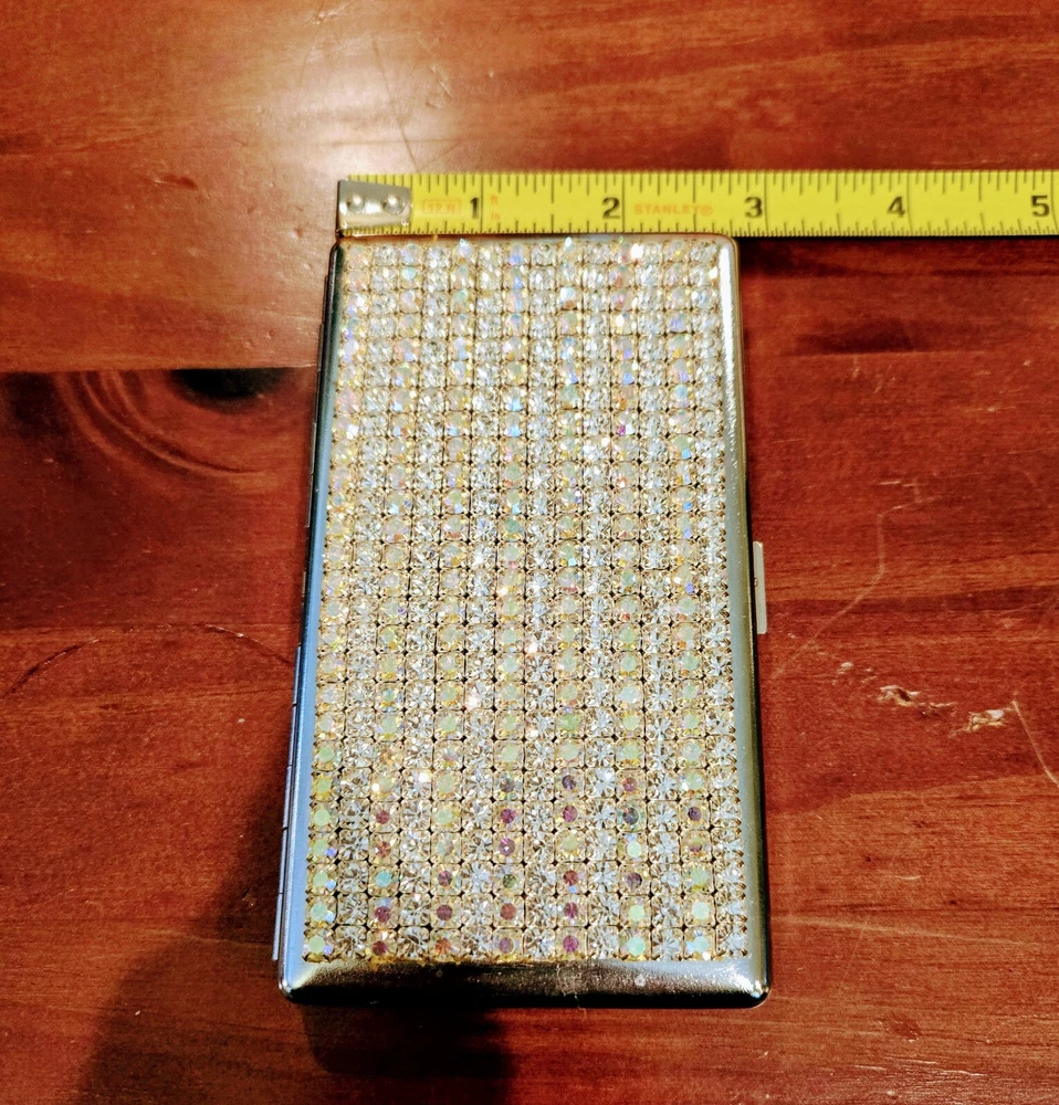 Diamond Rhinestone Silver Tone Cigarette Case features a glamorous design with rhinestones and a mirror inside. This case is designed to hold 100s size cigarettes, adding a touch of elegance to your smoking accessories. The silver tone adds a sleek and modern look to the case, making it a stylish and practical accessory for your cigarettes.