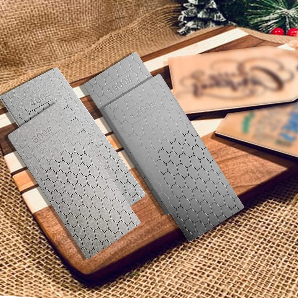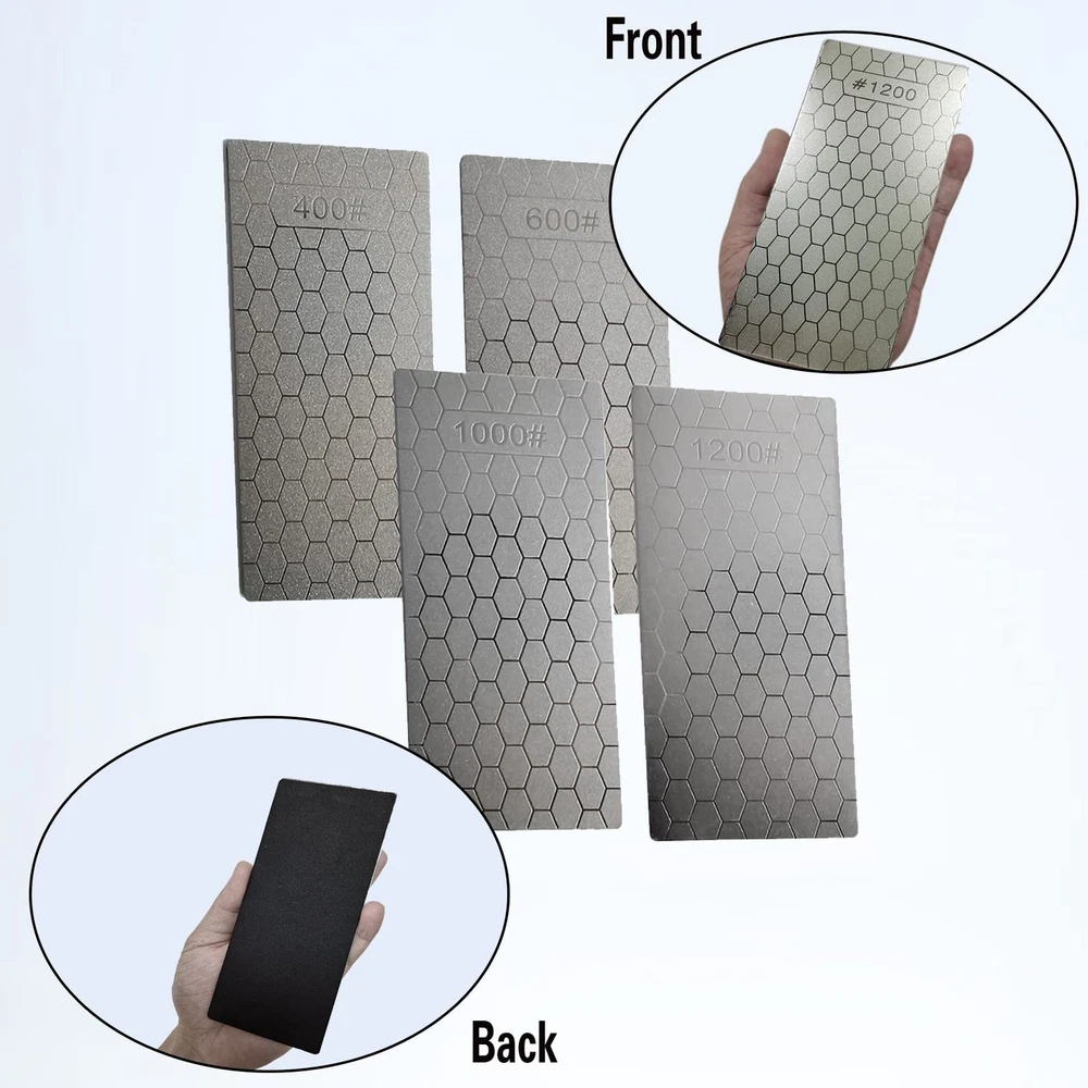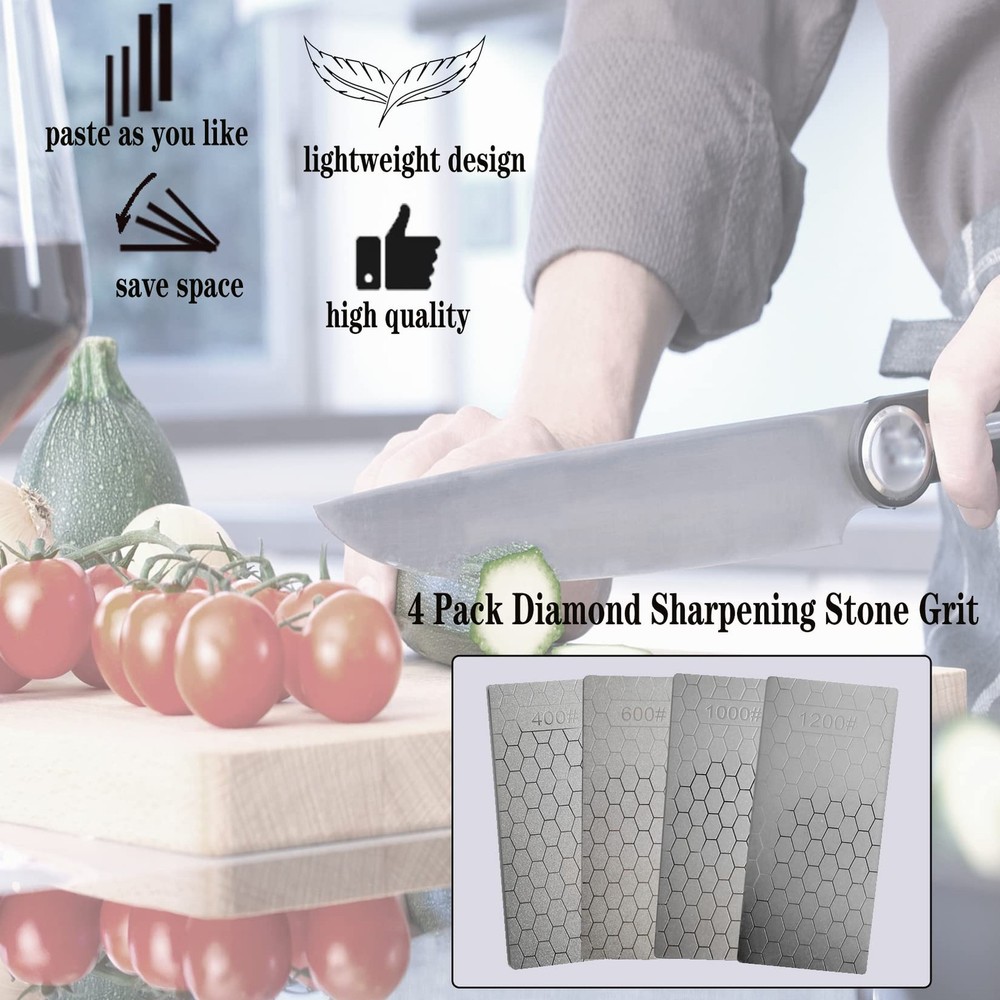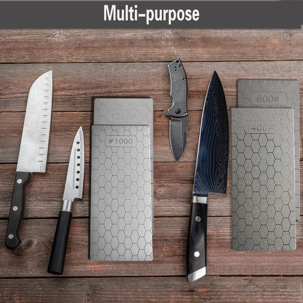 Compared with traditional grindstones, the advantages of these sharpening stones are that the grinding surface remains absolutely flat and will not form grooves over time Features: - High appearance, delicate and practical - Small and light, very suitable for carrying - This kind of diamond sharpening stone is suitable for tableware at home, especially the kitchen - This is essential in order to provide consistent straight edges on precision cutting tools such as wood chisels and plane irons Specification: Material: Diamond Sand Color: Silver Sharpening Stone: 400#, 600#, 1000#, 1200# Size: 15.2 x 6.3 cm/5.98 x 2.48 inch Thickness: 2mm Package Included: 4 x sharpening stones Warm Tips: - Do not put the sharpening stone in the dishwasher - Due to manual measurement, display brightness, lighting effects, etc., there may be slight differences in color and size between the photo and the actual object MATERIAL -- This kind of diamond sharping stone uses diamond as the abrasive, which is the hardest grinding medium at present HONEYCOMB DESIGN -- The unique honeycomb design ensures that the dust generated during the grinding process will not affect the sharpening effect COARSE GRINDING & FINE GRINDING -- Rough grinding first, then fine grinding. You can use 400# or 600# diamond grindstone to grind off the rust, and use 1000# or 1200# to make the blade sharper WIDE APPLICATION -- Suitable for kitchen tool sharpening, such as Cutlery, Scissors, Hunting pocket knives and Blades. This sharpening stone also works for Carving Knives, Gardening Tools etc VALUE PACKAGE -- 4 x diamond sharpening stones (400#, 600#, 1000#, 1200#); Size: 15.2 x 6.3 cm/5.98 x 2.48 inch; Thickness: 2mm; Weight: 79g. small and light, very suitable for carrying
