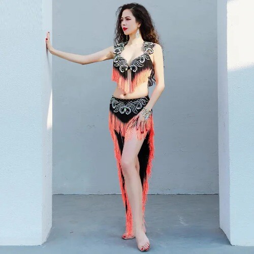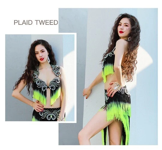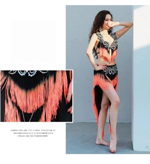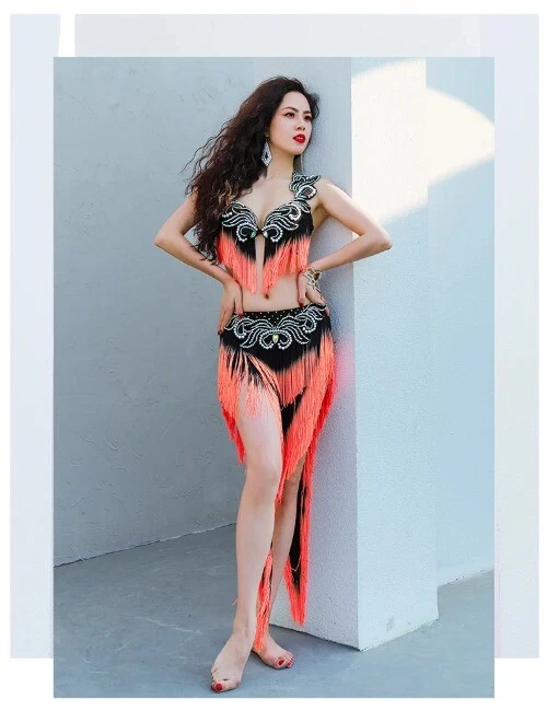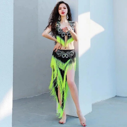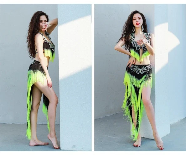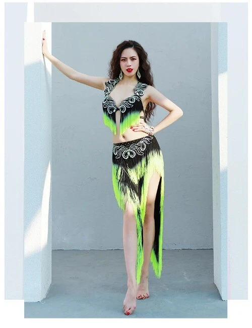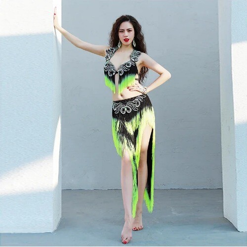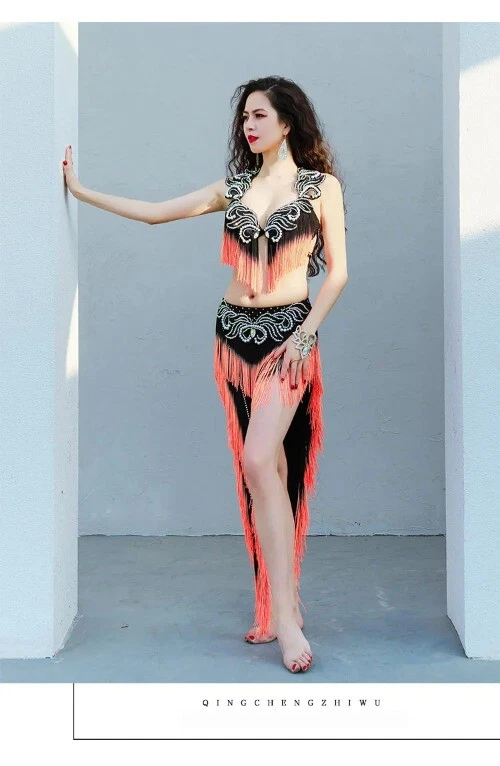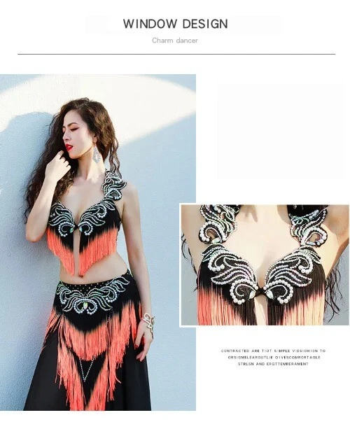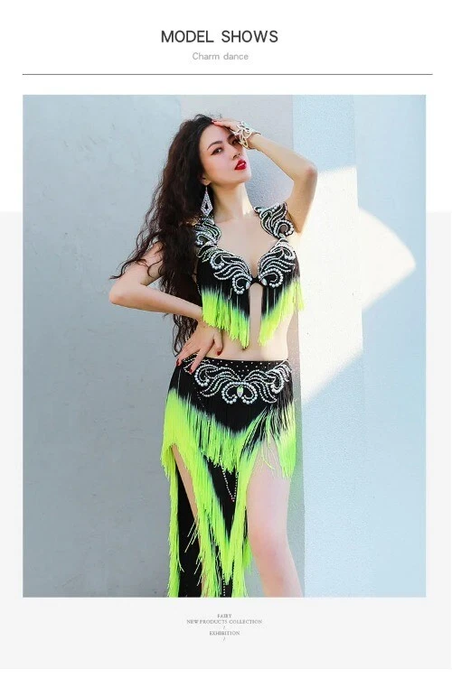 This belly dance set is absolutely stunning! The diamond-studded bra and long tassel skirt add so much sparkle and movement—perfect for performances. The craftsmanship is top-notch, comfortable yet eye-catching. Shipping took a bit longer than expected, but it was worth the wait. Great quality for the price! Would definitely recommend to any dancer looking for glamorous stage wear.
