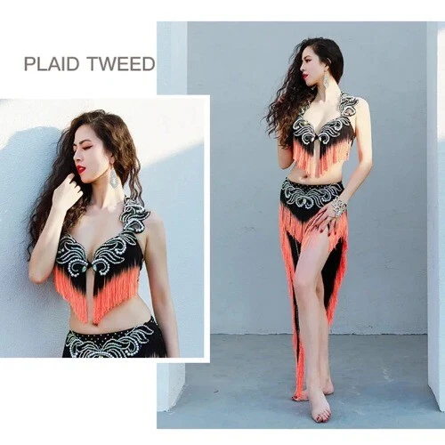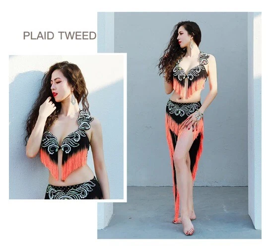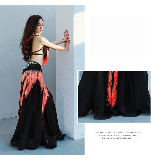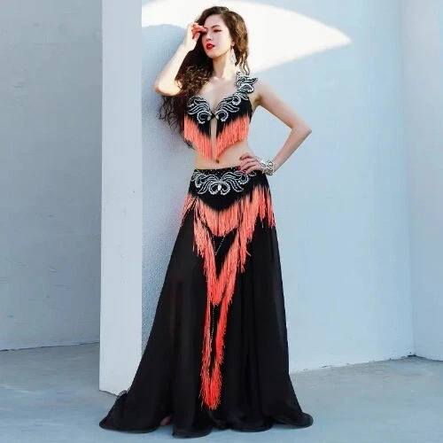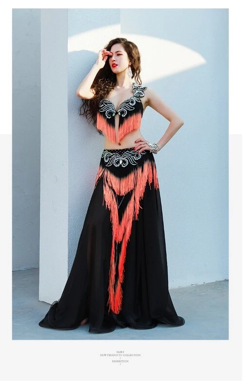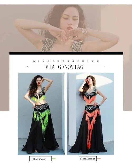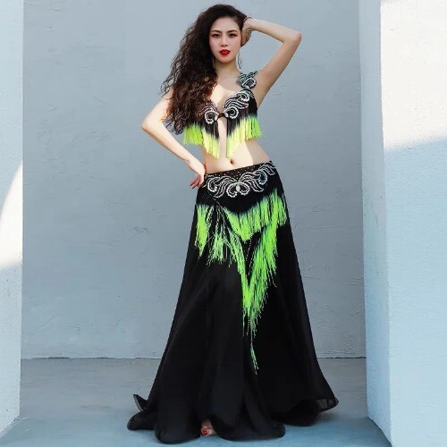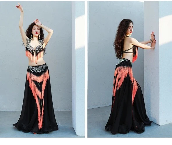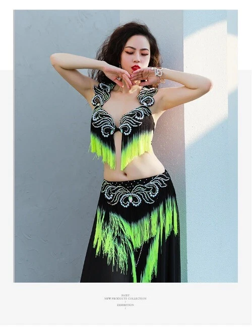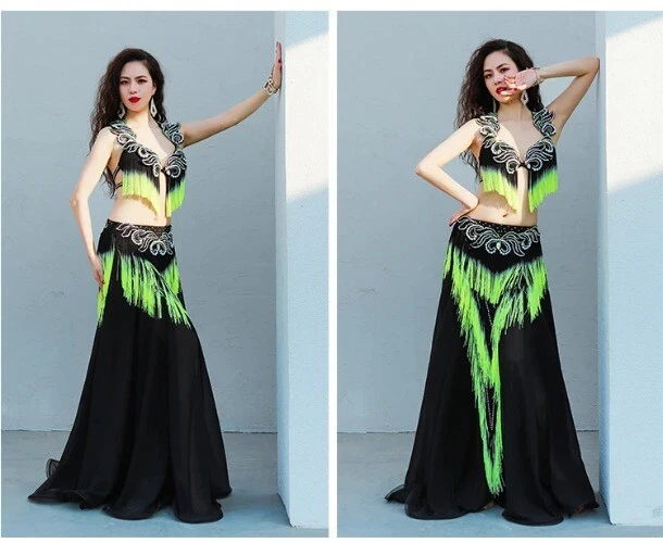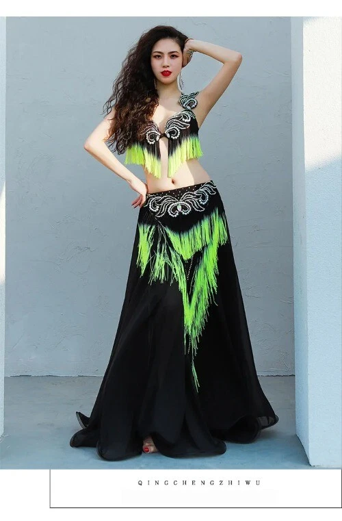 This belly dance set is absolutely stunning! The diamond-studded bra and long tassel skirt add so much sparkle and movement—perfect for performances. The craftsmanship is top-notch, comfortable yet eye-catching. Shipping took a bit longer than expected, but it was worth the wait. Great quality for the price! Would definitely recommend to any dancer looking for glamorous stage wear.
