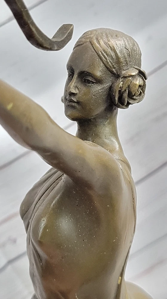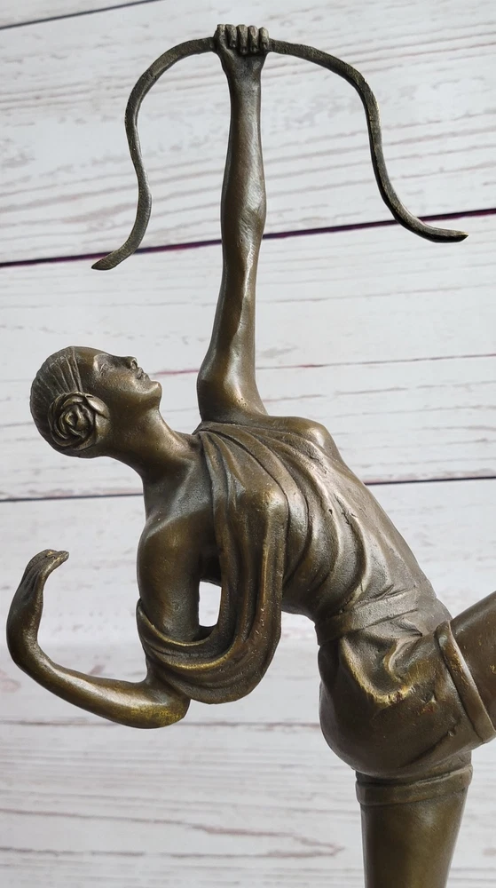 Condition : This sculpture is in perfect condition Bronze Dimensions with Marble Base: Height 17.5" X Width 7" Marble Dimensions: Diameter 5.5" Height without base:14" Weight:9 LBS Inventory:93YRD12434139 Dive into the rich artistic portrayal of the Greek goddess Diana with this intricately detailed sculpture by American artisan Fisher. Diana, a prominent figure in Roman mythology, embodies the spirit of the hunt, symbolizing a profound connection to the wilderness, wildlife, and the lunar sphere. Initially revered as the goddess of hunting, Diana was often accompanied by her youthful and graceful attendants, who joined her in the pursuit of prey. Over time, the Romans equated Diana with the Greek goddess Artemis, expanding her divine attributes to include those of a Moon goddess, complementing the domain of Luna. Honored in ancient Roman religion and revered in contemporary Religio Romana Neopaganism and Stregheria, Diana's influence remains significant, with dedicated shrines in Capua and Aricia, near Rome, serving as testaments to her enduring legacy. Regarded as the twin sister of the god Apollo, Diana is the daughter of Jupiter and Latona, exemplifying a formidable and respected deity within the Roman pantheon. Crafted with meticulous attention to detail, this stunning sculpture captures the essence of the legendary Diana, bringing to life the goddess's strength and grace. With a keen focus on artistic precision, the sculpture embodies the spirit of the hunt, showcasing Diana's connection to the untamed wilderness and her role as the protector of the woodlands. The intricate craftsmanship of the piece reflects the timeless allure and significance of Diana in Roman mythology, depicting her surrounded by the captivating energy of the hunt and the profound reverence for the natural world. As a powerful representation of divine femininity, Diana's portrayal in this sculpture is a testament to her enduring influence and cultural significance throughout history. Elevate your appreciation for classical mythology with this exquisite sculpture, a homage to the revered Greek goddess Diana. Crafted with the utmost dedication to artistic detail by American artisan Fisher, this masterpiece captures the essence of Diana's multifaceted persona, embodying her role as the goddess of the hunt, the protector of wildlife, and the revered lunar figure. The sculpture's intricate design and lifelike representation convey Diana's prowess and elegance, highlighting her influence over the natural world and her significance within ancient Roman mythology. With every meticulously sculpted detail, the sculpture pays homage to Diana's enduring legacy and her lasting impact on the realms of nature and the divine. Artemis Diana the Huntress Archer w/ Bow Bronze Sculpture Statue Figure YRD-1243nbsp; Video will open in a new window Using the eBay App? Paste link into a browser window: [isdntekvideo]