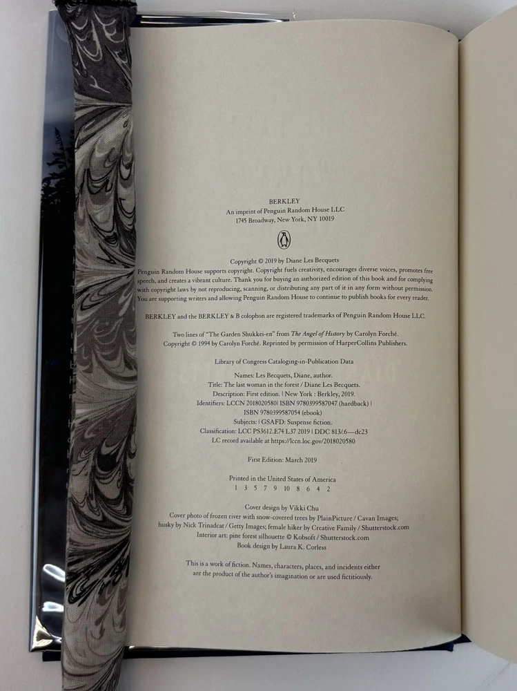 THE LAST WOMAN IN THE FOREST [Signed] Author: Les Becquets, Diane Title: THE LAST WOMAN IN THE FOREST [Signed] Publication: New York, New York: Berkley, 2019 Edition: First Edition, First Printing Description: Octavo, 340 pages. In Very Good condition with Near Fine condition dust jacket. Spine is black and blue with white lettering. Dust jacket protected by mylar covering, price uncut: "$26.00" on front flap. Boards have moderate shelving wear along spine head, spine tail, and joints. Signed flat by Diane Les Becquets on title page. Shelved in hallway. Seller ID: 1391886 Subject: Literature Welcome to the eBay store of Second Story Books! DC's Oldest Rare and Used Bookstore, Second Story Books operates two open shops in the Washington D.C. metropolitan area. We have an extensive internet presence and provide accredited appraisals member ASA. This listing was created by Bibliopolis.