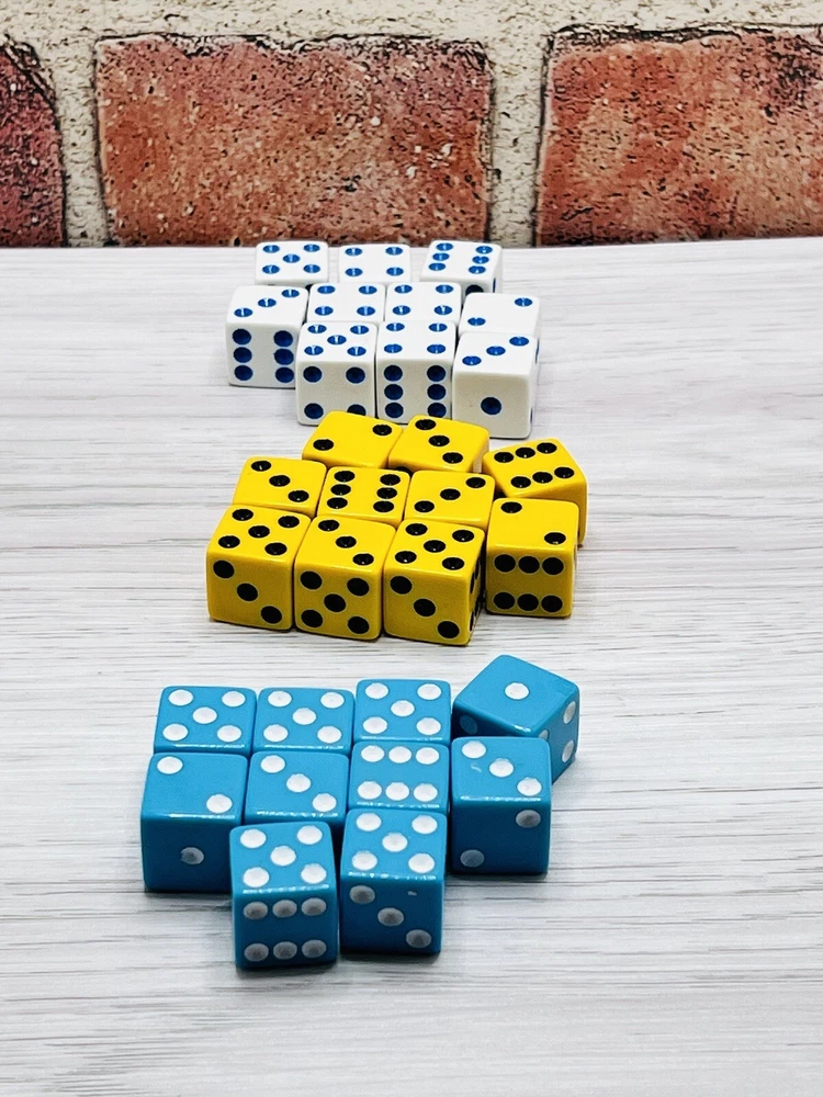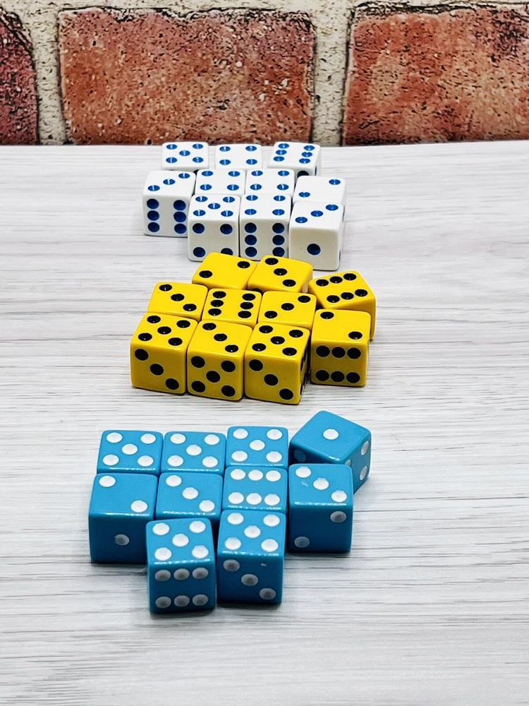 This is a lot of dice. 30 dice total. 10 yellow blk, 10 blue white and 10 white blue 30 total. They are Standard size and weight dice. Replacement dice for board games or role-playing games craps CeeLo multipurpose. Exact items in the photos are the exact items you receive. These items are in great condition. Please visit our store a few more items like these.