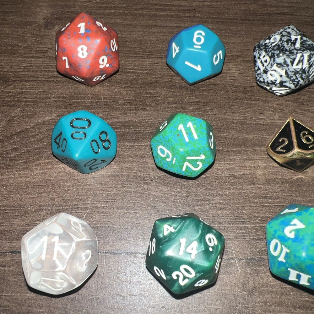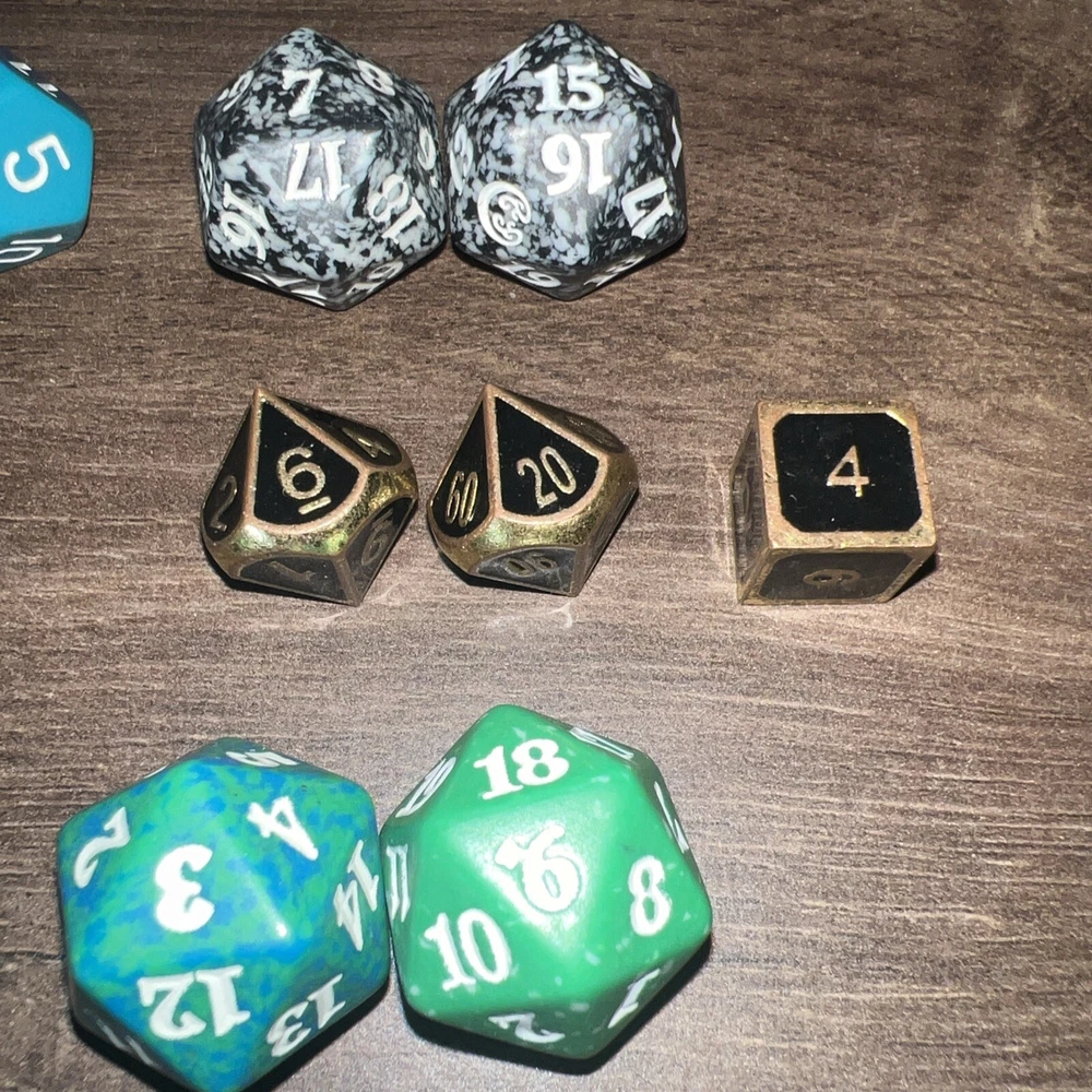 Lot of 13 dice. 3 die are brass metal. The rest are plastic I guess? This Dice Lot is perfect for any fan of Dungeons & Dragons. The set includes a variety of dice that are sure to come in handy during your next gaming session. With characters from the beloved franchise, this set is a must-have for any collector. Featuring a range of colors and designs, these dice are not only functional but also a great addition to any collection. Whether you're a seasoned player or just starting out, this Dice Lot is sure to impress.