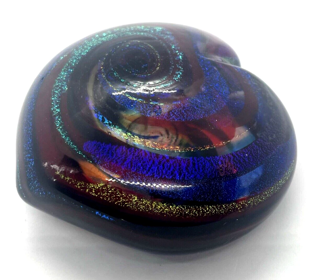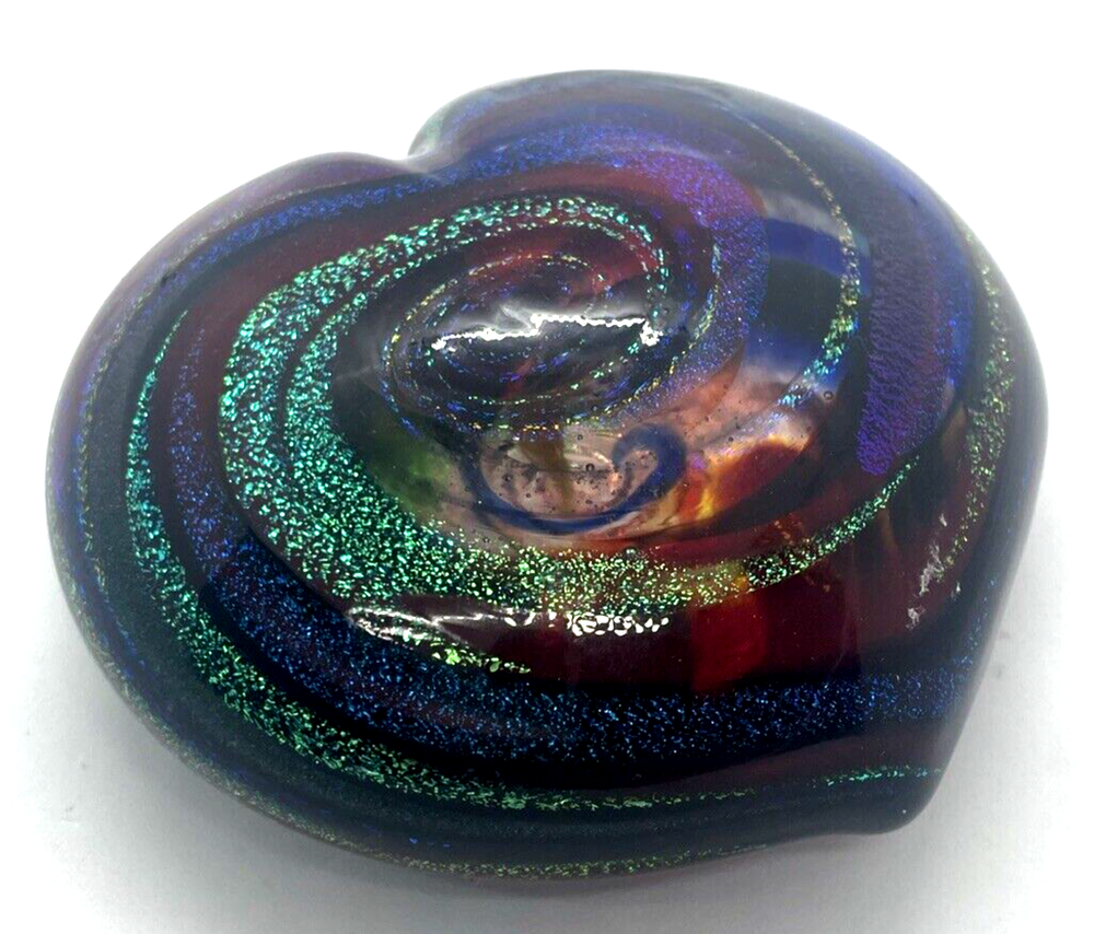 Mad Art Studios Dichroic Swirl Art Glass Heart Paperweight Signed This heart paperweight is in excellent pre owned condition. There are no chips or cracks. It measures 3.5" x 3.25" Please note the photos for detail.