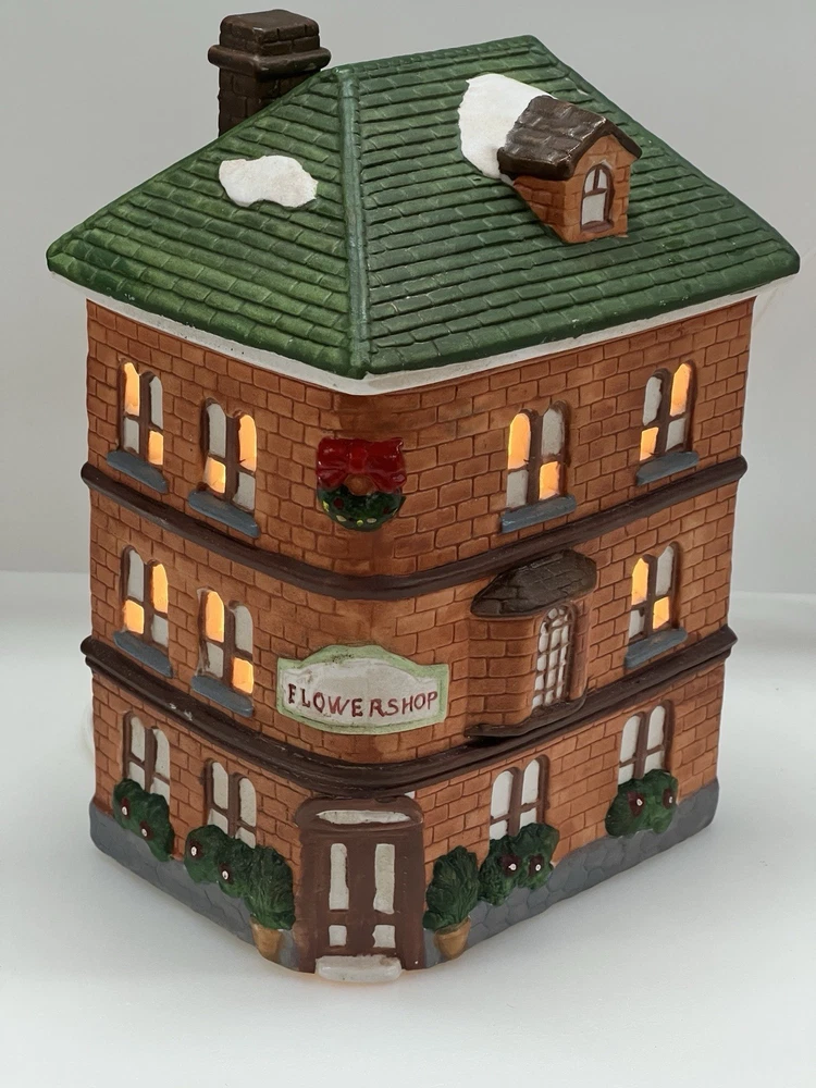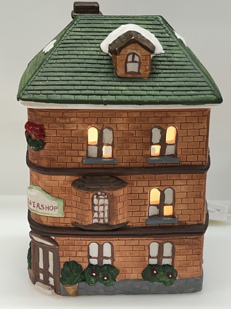 The Dickens Collectables Village House Holiday Expressions FLOWER SHOP Illuminated is a medium-sized, asymmetrical village house collectible manufactured in 1992. This contemporary piece features a multicolor flower shop design with a matte finish, perfect for any room in your home. Made of porcelain, this original piece from the late 20th century is part of the Holiday Expressions collection and would make a lovely addition to your holiday village display. Perfect condition , no original box , comes with light & cord
