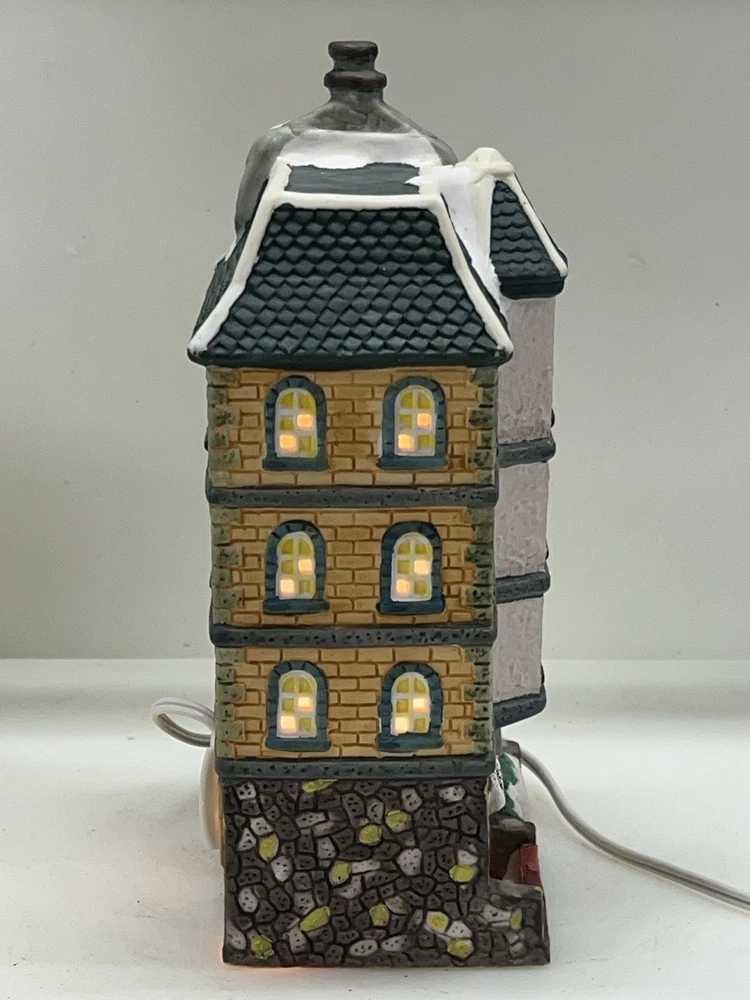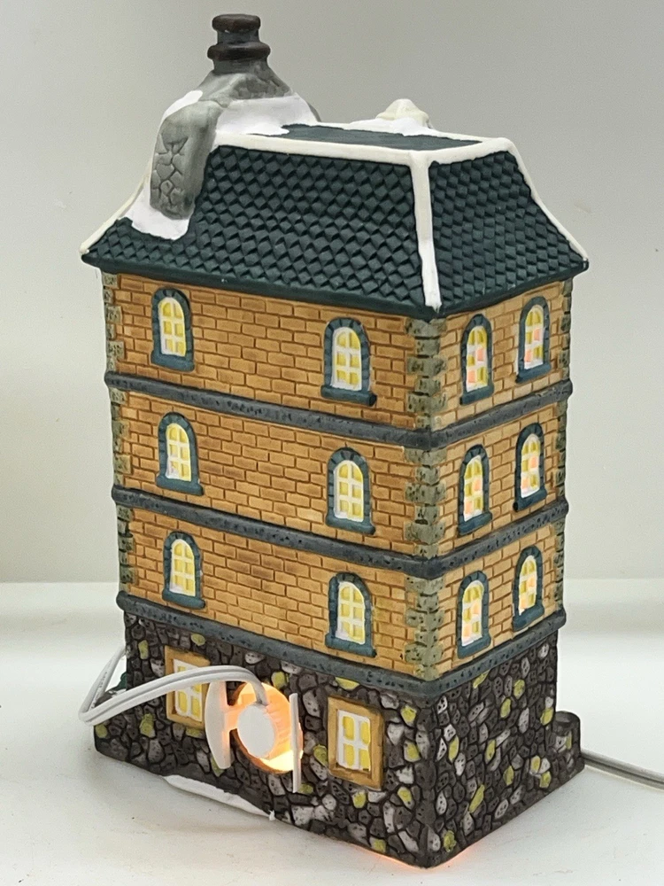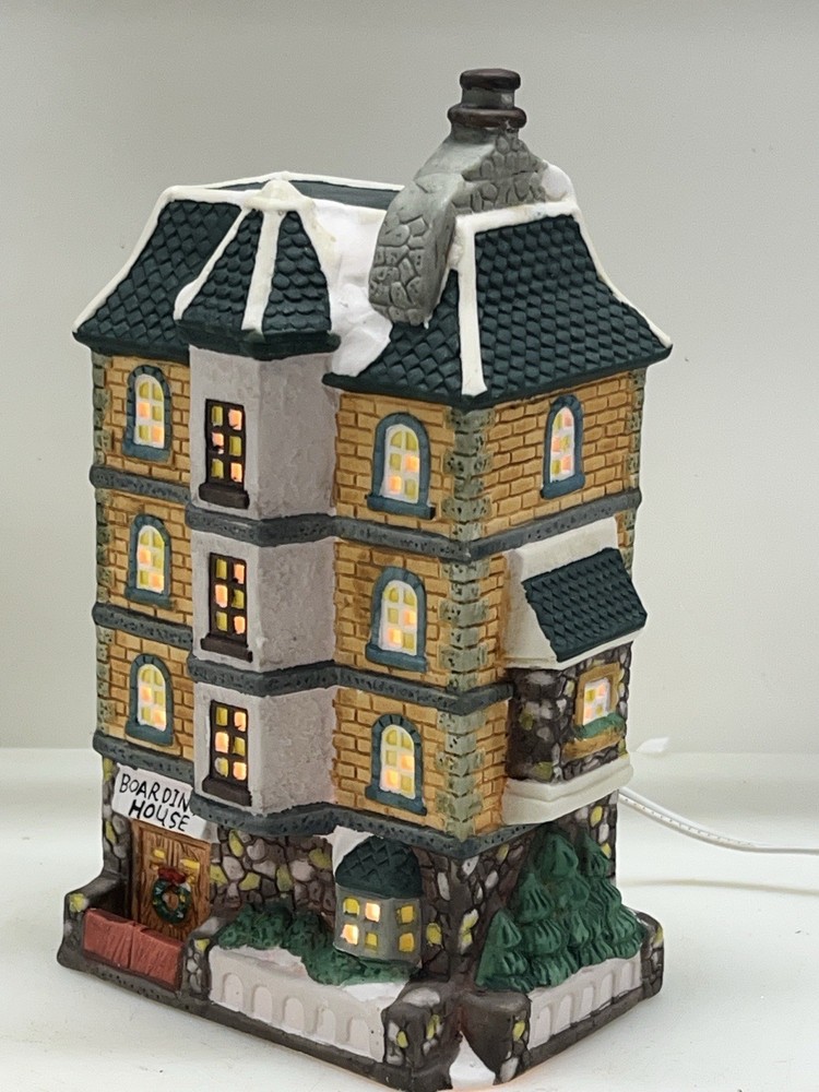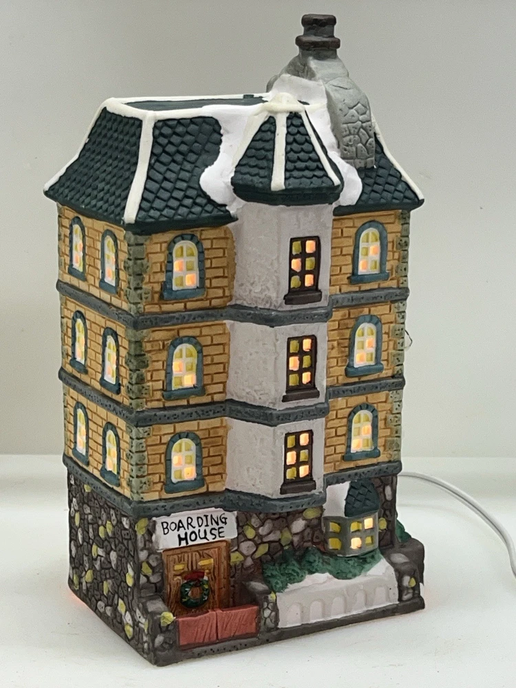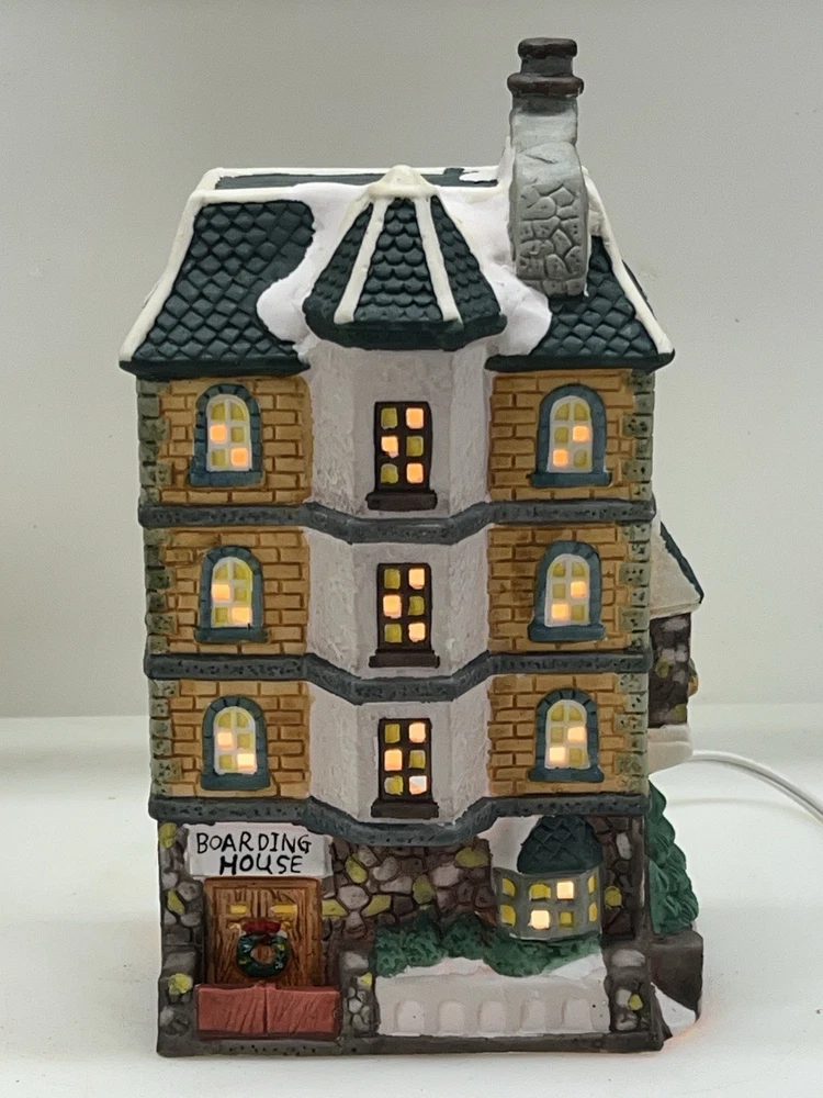 The Dickens Collectables Towne Series Porcelain Boarding House is a whimsical Victorian-style Christmas village house from 1995. This medium-sized piece is hand-painted with a multicolor finish, making it a charming addition to any room during the holiday season. The collectible comes boxed in its original packaging, suitable for a village display. With its intricate details and nostalgic character, this Dickens Village piece is sure to delight collectors of holiday and seasonal decor. Excellent like new condition, comes with all clean original packaging including cord and light Ct