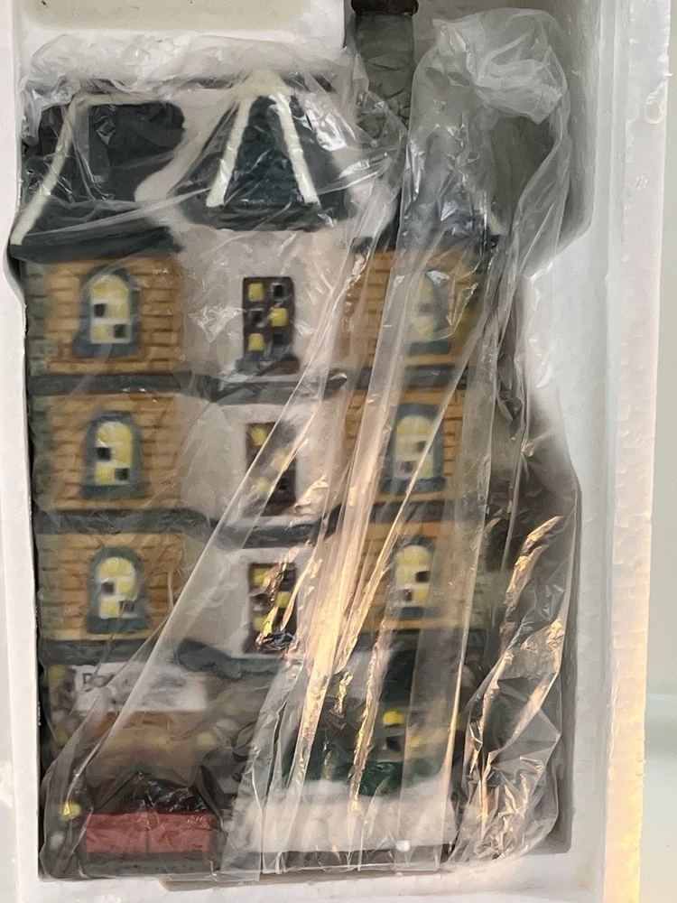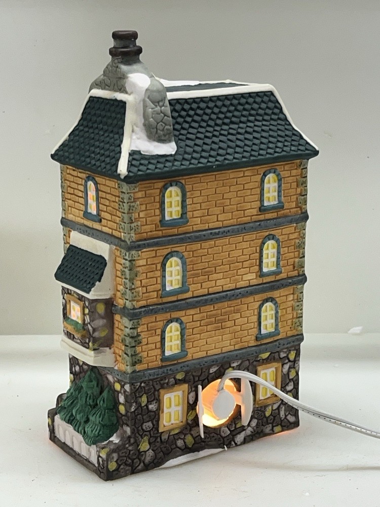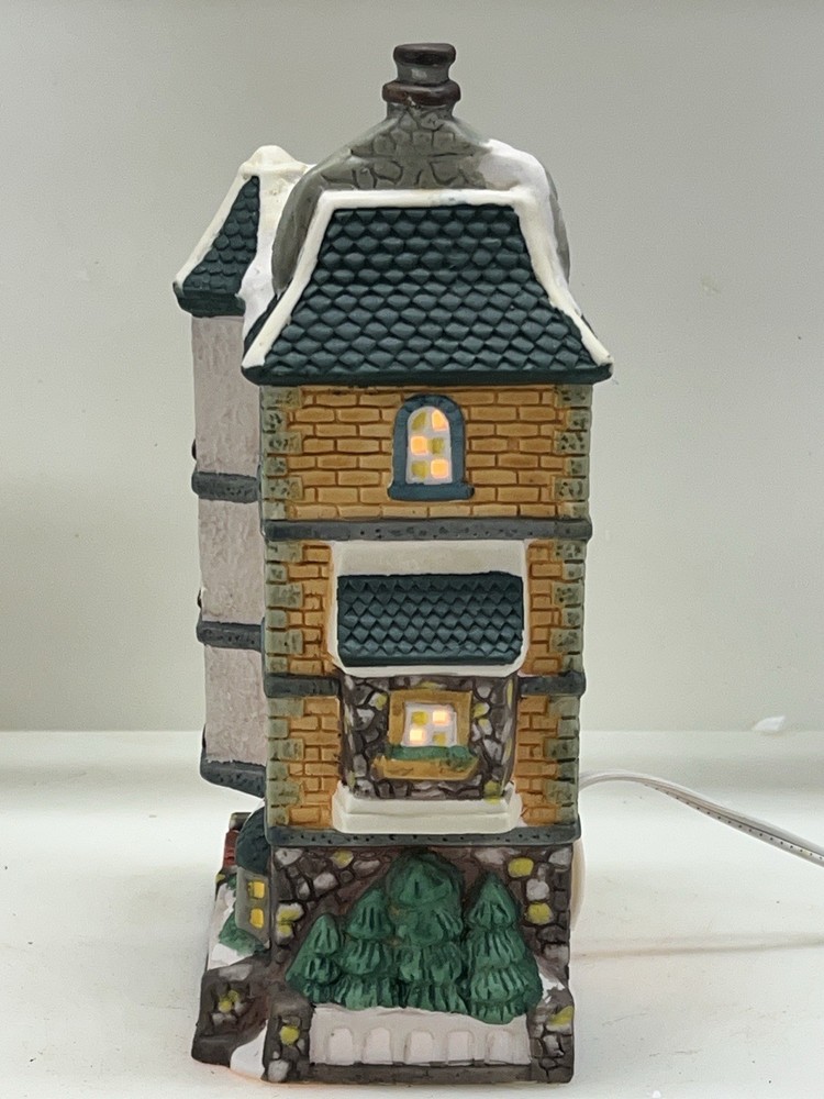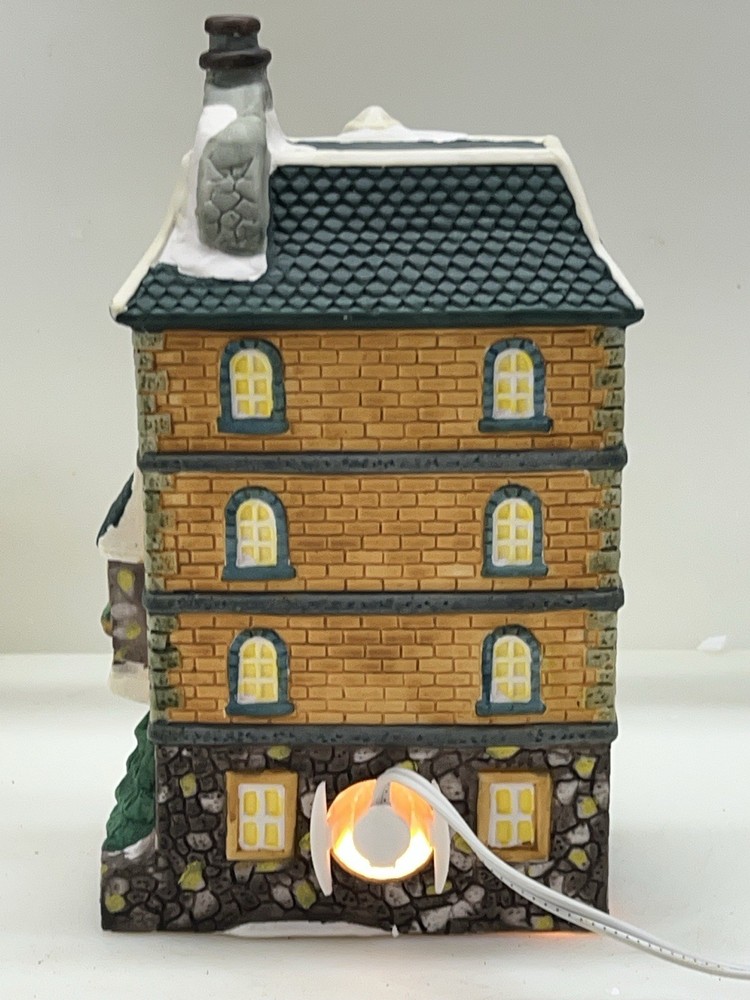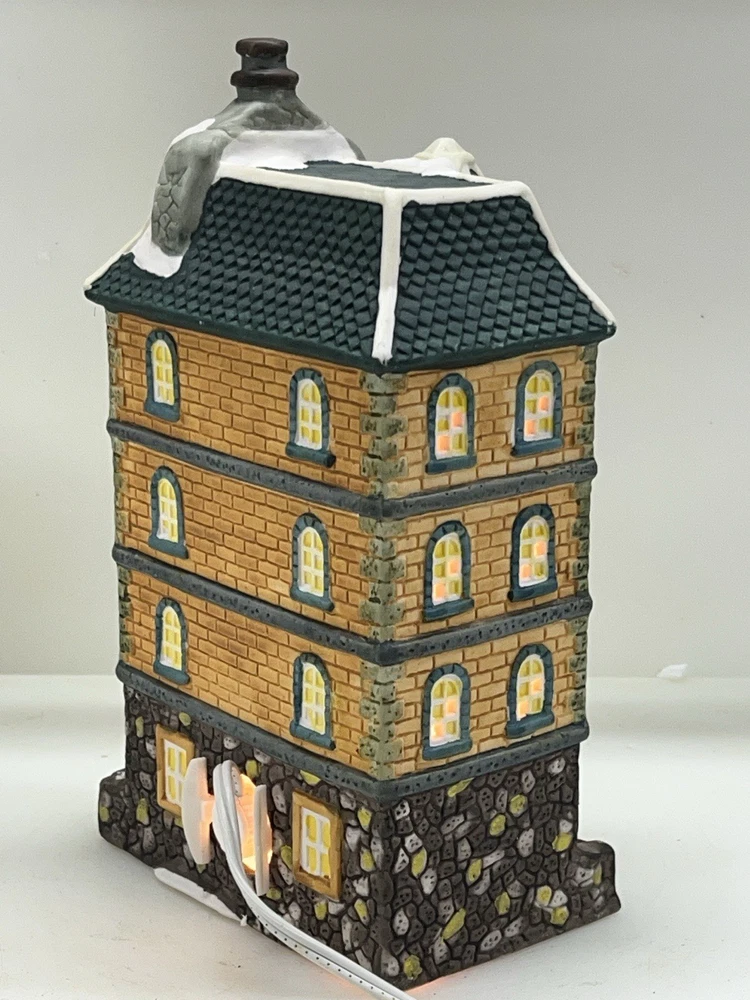 The Dickens Collectables Towne Series Porcelain Boarding House is a whimsical Victorian-style Christmas village house from 1995. This medium-sized piece is hand-painted with a multicolor finish, making it a charming addition to any room during the holiday season. The collectible comes boxed in its original packaging, suitable for a village display. With its intricate details and nostalgic character, this Dickens Village piece is sure to delight collectors of holiday and seasonal decor. Excellent like new condition, comes with all clean original packaging including cord and light Ct