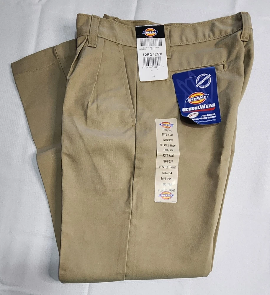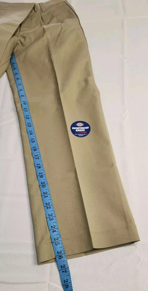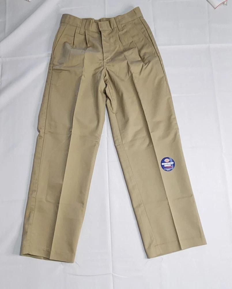 This pair of Dickies pants is perfect for any young boy's school or work uniform. The khaki color and classic fit make them versatile for any occasion. The pants feature a zip and hook & eye closure, as well as pockets for added convenience. Made from a blend of polyester and cotton, these pants are easy to care for and comfortable to wear. They have a 26-inch inseam and are machine washable. Whether your child is playing, walking, or attending school, these pants are sure to be a durable and stylish choice.
