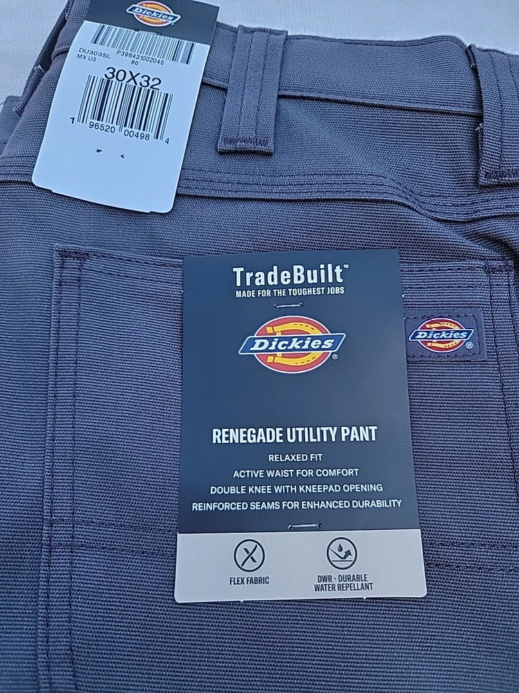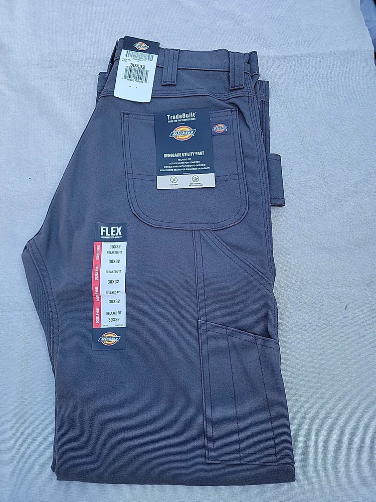 Dickies carpenter work pants. Size 30/32. Gray. Renegade Utility pants with double Knee, Knee pad opening, Flat Front, 5 pocket design. Relaxed Fit Flex. Machine washable.