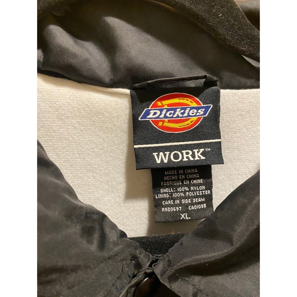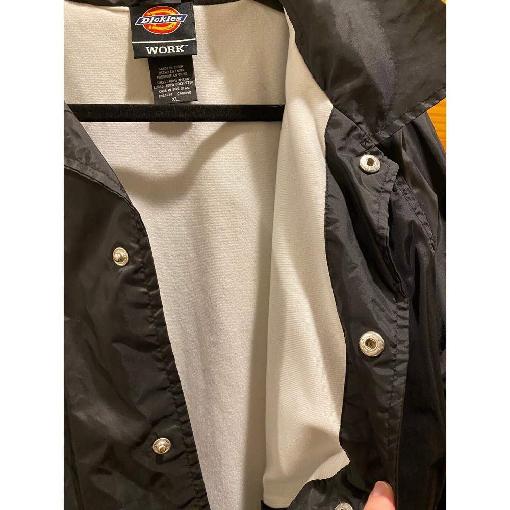 Brand: Dickies Lining Material: Polyester Country/Region of Manufacture: Unknown Season: Spring, Fall Type: Jacket Performance/Activity: Skateboarding, Walking, Workwear Accents: Logo, Snap Features: Lightweight, Snap Front, Pockets, All Seasons Pattern: Solid Size: XL Outer Shell Material: Nylon Closure: Snap Color: Black Vintage: No Department: Men Size Type: Regular Model: Dickies Coaches Style: Windbreaker Occasion: Casual, Workwear