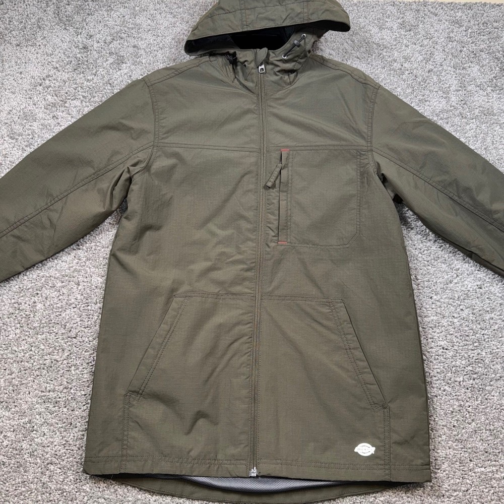 *The Original Dickies tags were removed, but the tags from the store of purchase were not. This is brand new and unworn* ================= Discover rugged reliability with this Dickies hooded jacket. The practical design features a full zip front, adjustable hood, and multiple pockets including a chest zip pocket and two lower patch pockets, ensuring you have space for essentials. The durable ripstop fabric offers a unique texture and resilience, while the clean olive green color makes it a versatile layering piece. Perfect for everyday wear or outdoor adventures. Measurements: • Length: 29 in • Sleeve Length: 20 in Type: Jacket Style: Windbreaker Outer Shell Material: Polyamide Department: Unisex Adults Closure: Zip Fabric Type: Occasion: Casual Accents: Zipper, Logo Country of Origin: Bangladesh Features: Lightweight, Full Zip, Removable Hood, Water Resistant Fit: Regular Garment Care: Machine Washable Keywords: Dickies jacket, men's outerwear, hooded jacket, olive green, lightweight, ripstop, utility, casual wear, workwear, outdoor, travel, windbreaker, Rip Stop