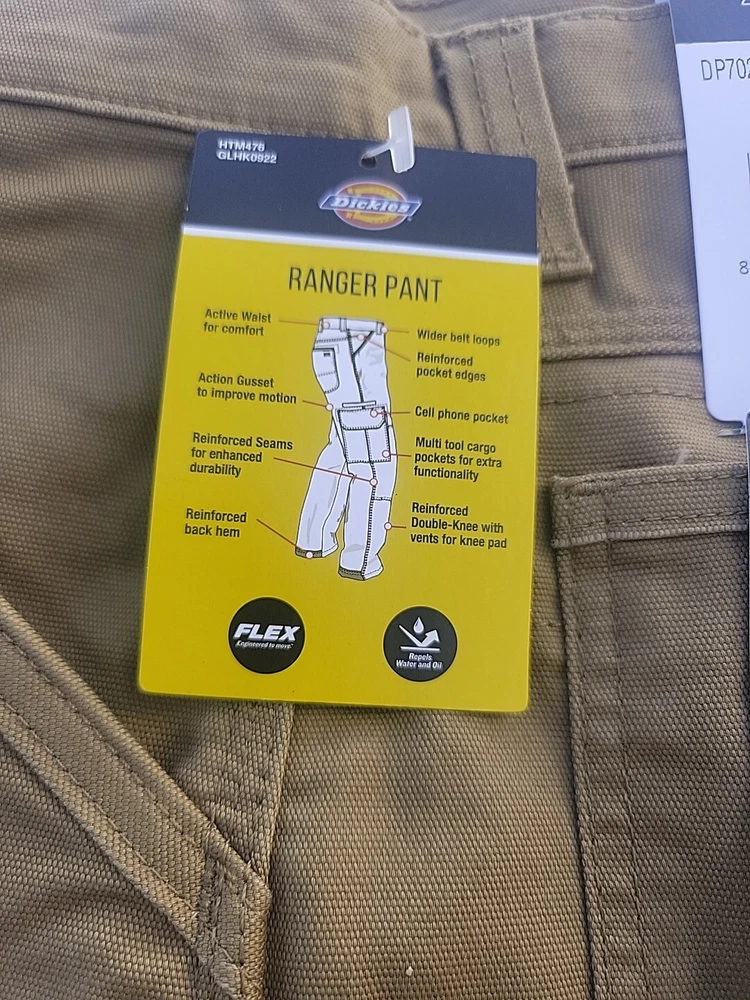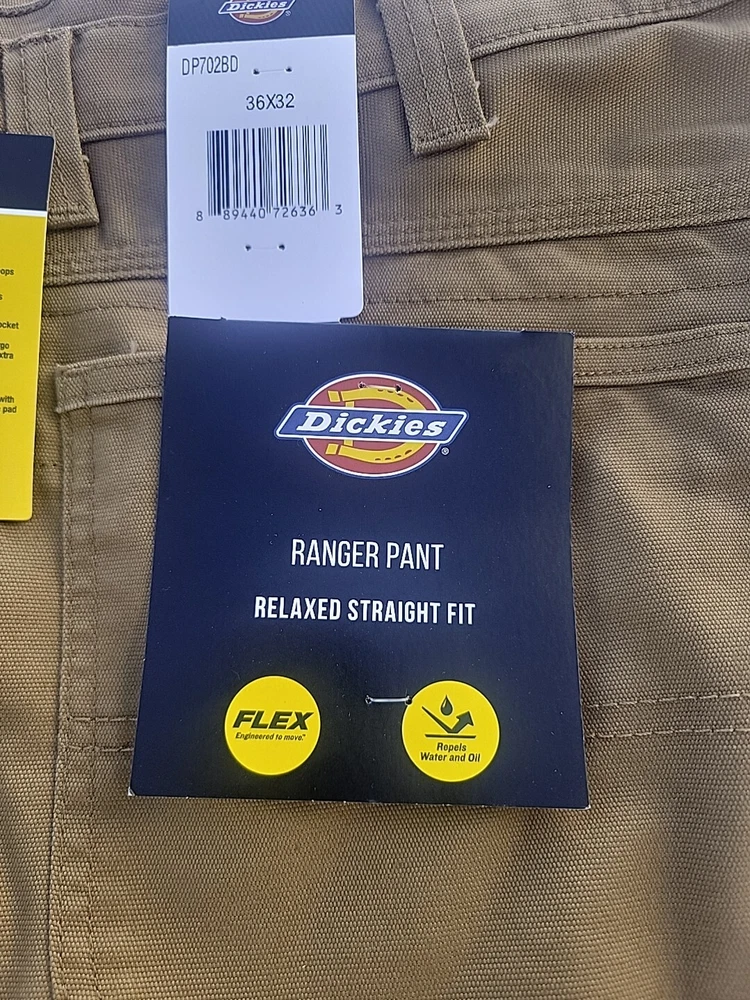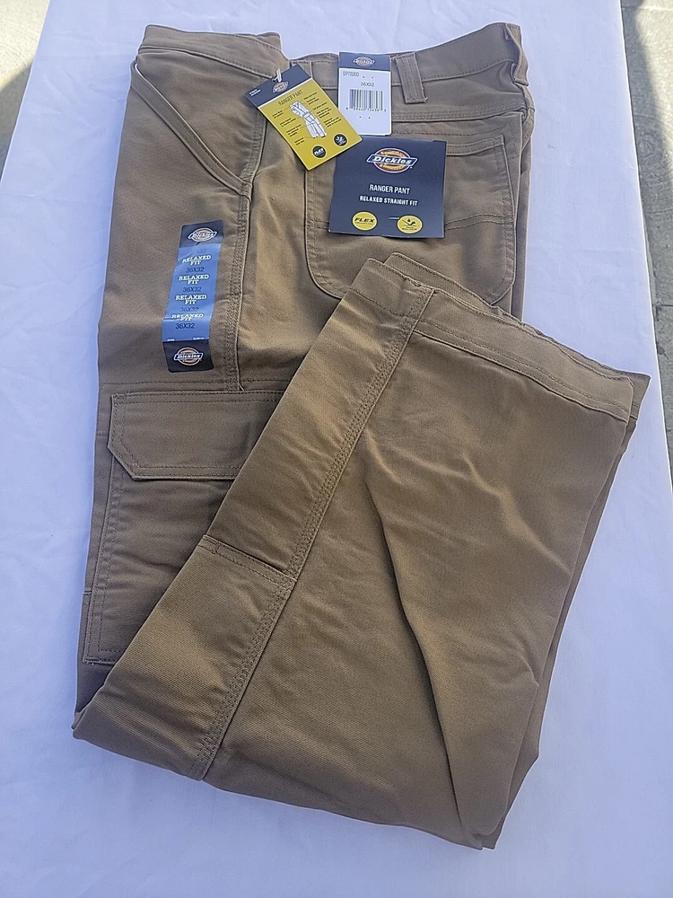 Dickies Ranger work pants. 36/32, RUST. Relaxed Fit, straight leg, cargo pockets, cell pocket. Active waist, wider belt loops, double knee, Repels water and oil. 68% Cotton, 30 % polyester, 2% spandex.